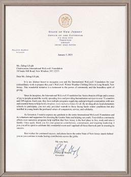 올해 뉴저지주 롱브랜치에서 열린 위러브유 겨울의류 기부운동을 준비해 주신 귀하와 국제위러브유의 특별한 노력을 표창하게 되어 정말 영광입니다. 이 놀라운 활동은 지역사회의 힘과 무한한 기부 정신을 보여주는 증거입니다.
