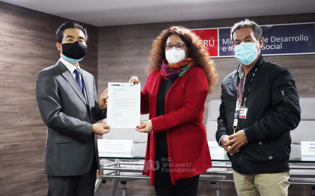 On June 2, the wheelchair donation ceremony was held at MIDIS located in Lima, Peru. The Minister of Social Inclusion and Development, the head of Yavari district office, and the manager of the WeLoveU branch in Faucett, Peru attended the event while adhering to COVID-19 guidelines. The donated goods were displayed before the podium.
