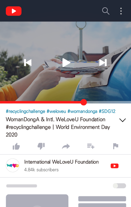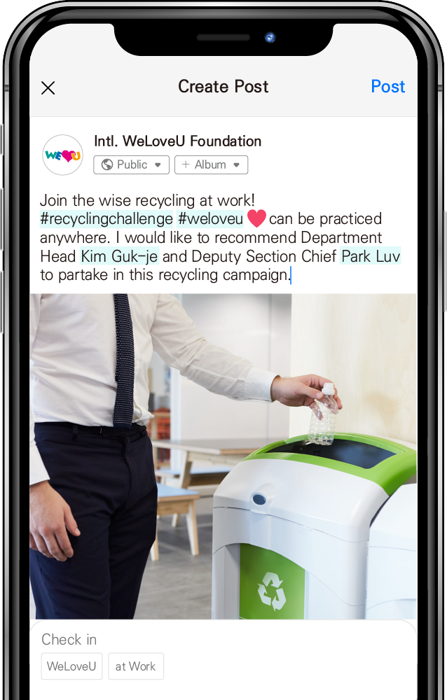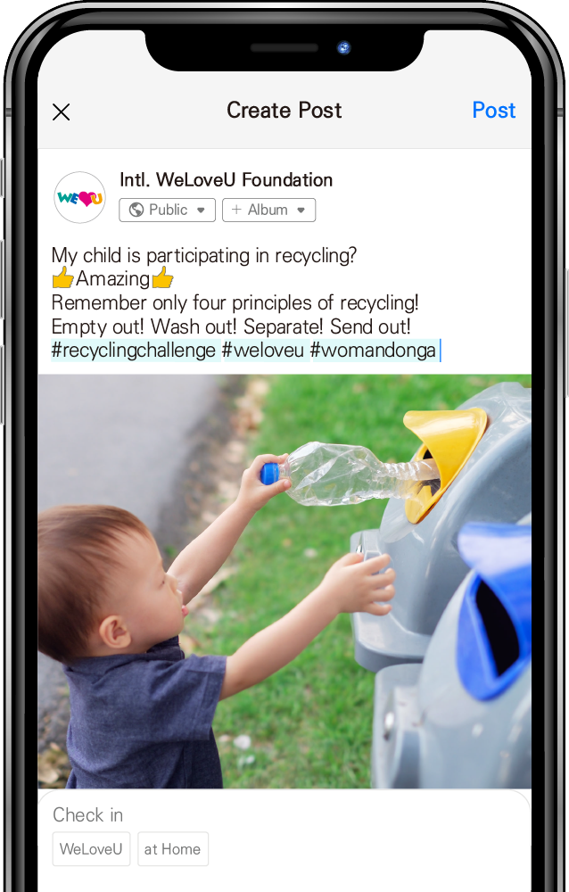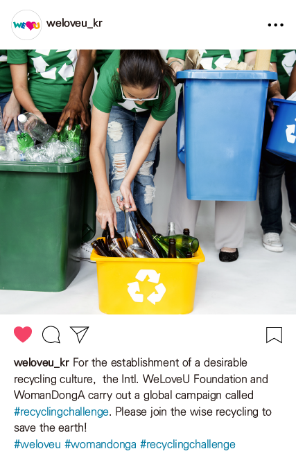 For the establishment of a desirable recycling culture and recycling of resources, the WeLoveU Foundation and WomanDongA carry out a global campaign called #recyclingchallenge. “Please express your willingness to save the earth and the environment through #recyclingchallenge!”