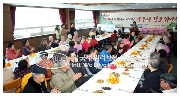 Este es el 12.º Evento para Compartir Amor Saludando el Feriado Nacional. El 31 de enero, a pocos días del Día de Año Nuevo Lunar, los miembros de la Fundación Internacional WeLoveU visitaron Beobwon-eup, una hermosa región rural de la ciudad de Paju, provincia de Gyeonggi, donde se cultivan productos orgánicos. Esta región está estrechamente relacionada con la fundación; a través del último Concierto Nueva Vida que ayudó a los niños que sufren de enfermedades cardíacas y enfermedades raras, además de trabajadores extranjeros heridos, la fundación donó fondos para los gastos médicos de los niños desafortunados que viven en esta región. Esta vez, los miembros de la fundación llevaron a cabo una fiesta de consuelo para cien ancianos que viven solos o permanecen en instituciones, en la sala de conferencias multipropósitos del segundo piso de la oficina de Beobwon-eup.