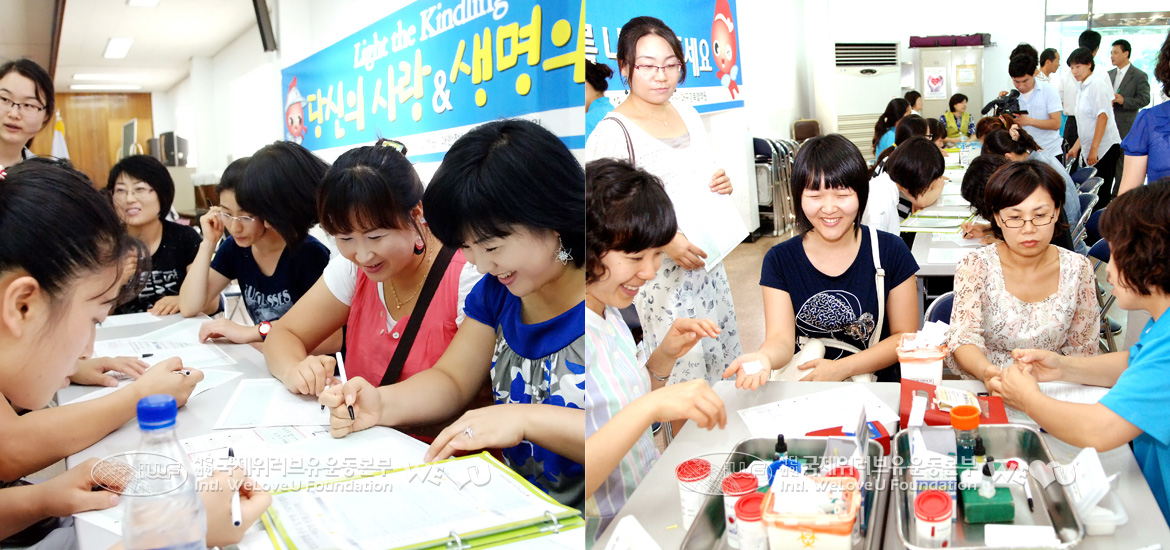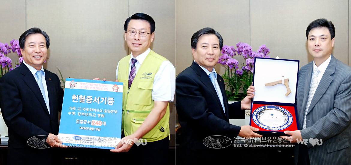 La Fundación Internacional WeLoveU donó al Hospital Nacional Universitario Kyungpook 240 tarjetas oficiales de registro de donantes de sangre recolectadas hasta las 5 p.m. de aquel día. Jo Yeong-lae, el director del hospital, agradeció a los miembros por su ayuda en los momentos difíciles de suministro de sangre, y les otorgó una placa de gratitud. Él expresó: “Siguiendo su buena voluntad, utilizaremos estas tarjetas de registro para ayudar a los pacientes necesitados”.