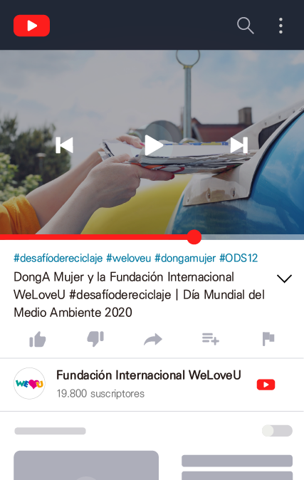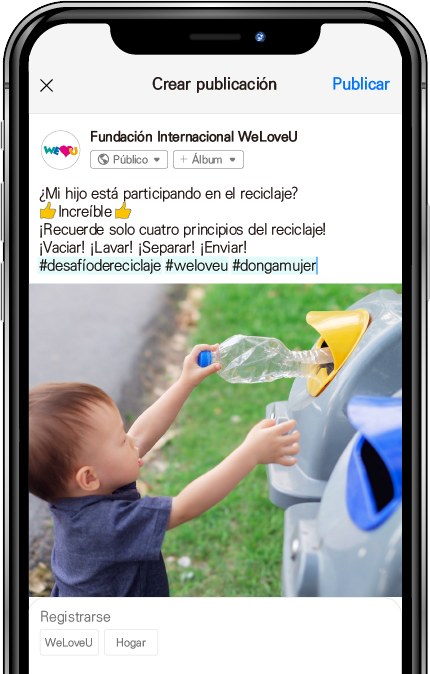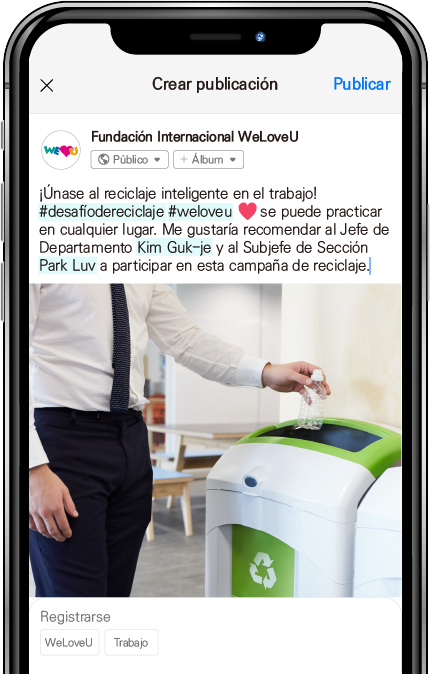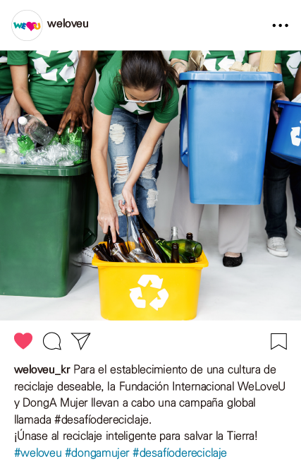Para el establecimiento de una cultura de reciclaje deseable y el reciclaje de recursos, la Fundación Internacional WeLoveU y DongA Mujer llevan a cabo una campaña global llamada #desafíodereciclaje. “¡Exprese su voluntad de salvar la Tierra y al medio ambiente a través del #desafíodereciclaje!”