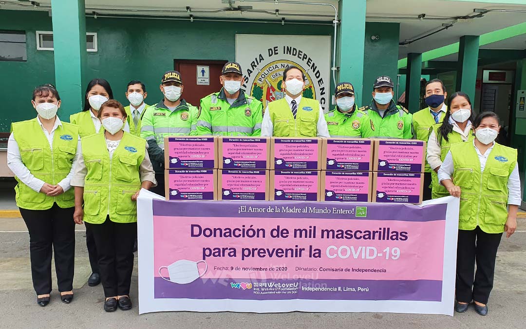 El 19 de noviembre, los miembros de la Fundación Internacional WeLoveU (denominada en lo sucesivo “WeLoveU”) en Lima, Perú, donaron 1000 mascarillas a la Comisaría de Independencia. Fue para expresar gratitud a los policías quienes estuvieron trabajando duro para la prevención de la pandemia y la seguridad de los ciudadanos, sin descanso en medio de la propagación de la COVID-19. Nueve miembros de WeLoveU y cinco oficiales de policía participaron en la ceremonia de entrega.