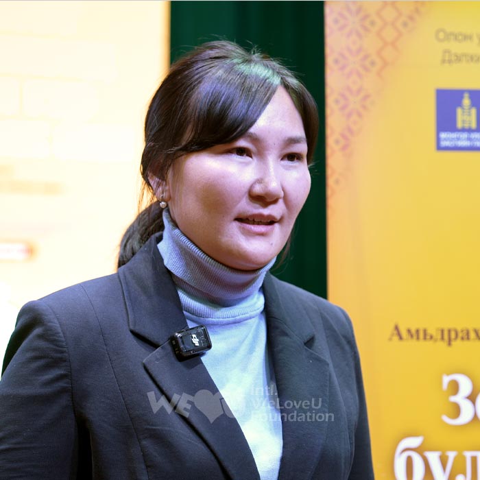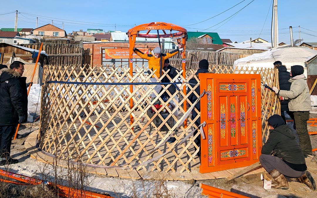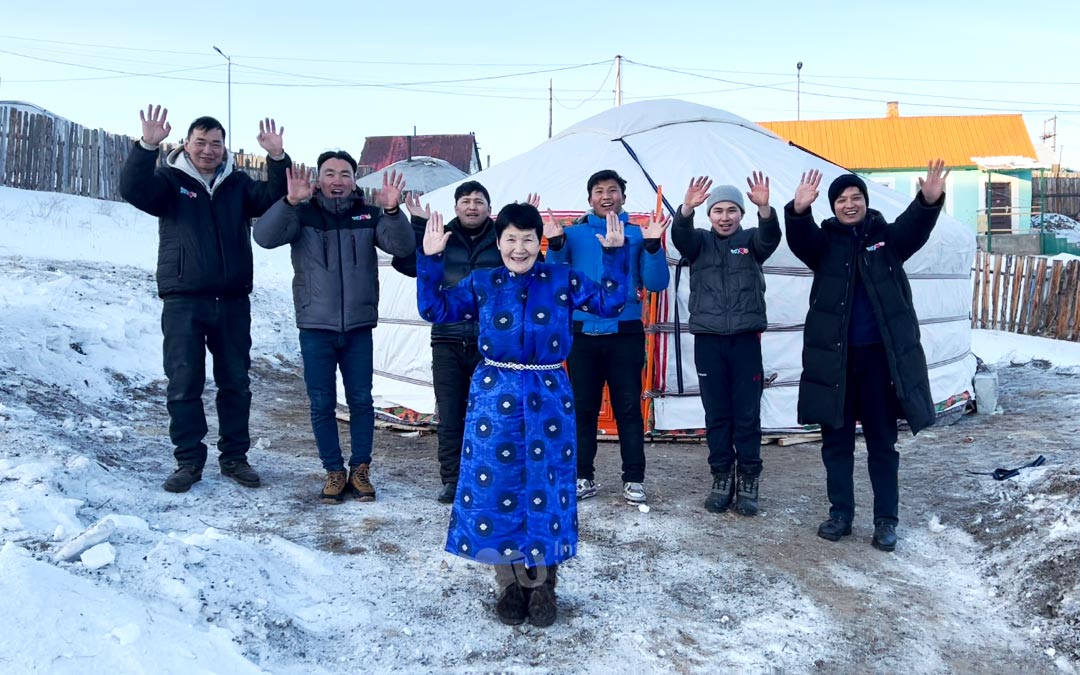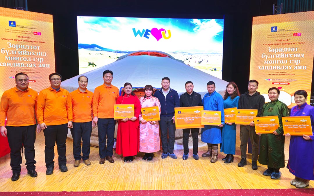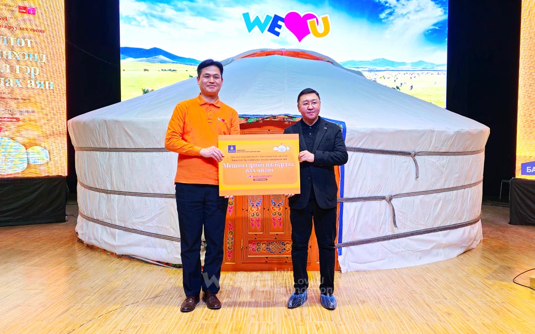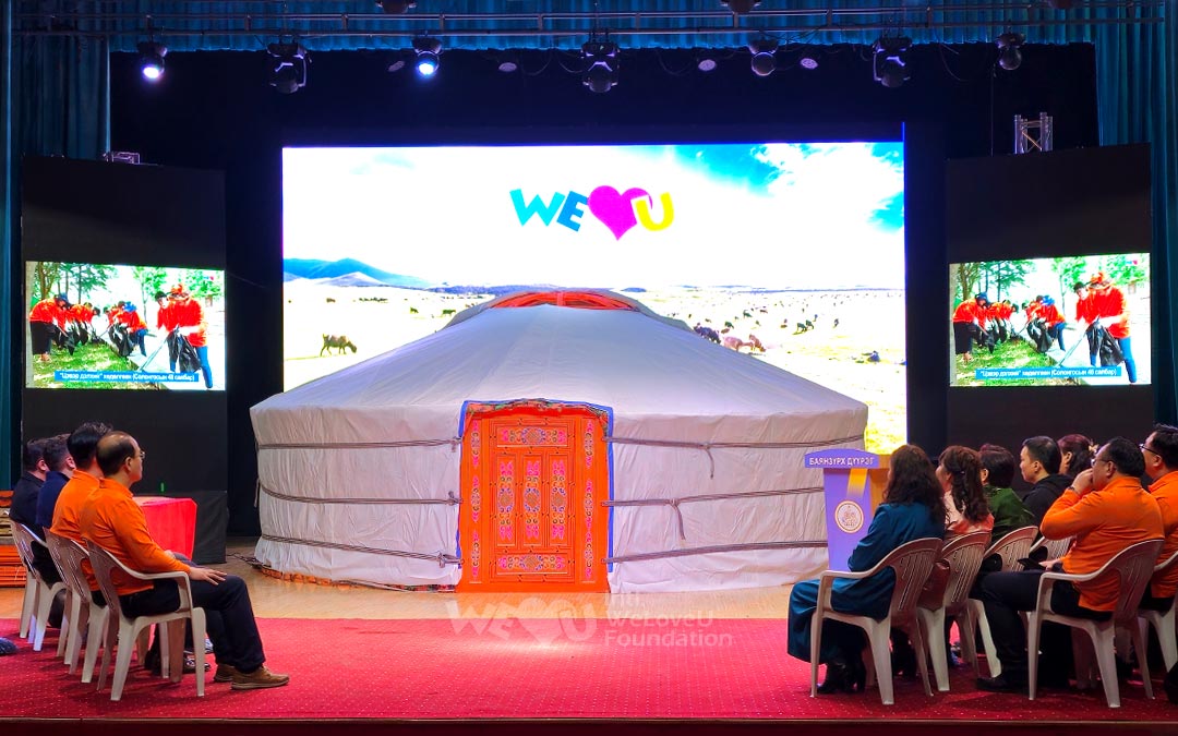 El 31 de enero, WeLoveU proporcionó gers1 a siete familias en Ulán Bator a través del Ministerio de Trabajo y Protección Social de Mongolia. La ceremonia de entrega se llevó a cabo en el Centro Cultural del distrito de Bayanzurkh en Ulán Bator, Mongolia. Un gran ger instalado en el escenario dio la bienvenida a los asistentes.