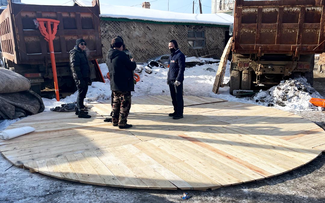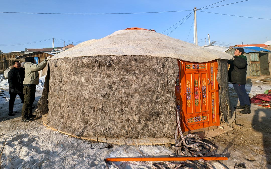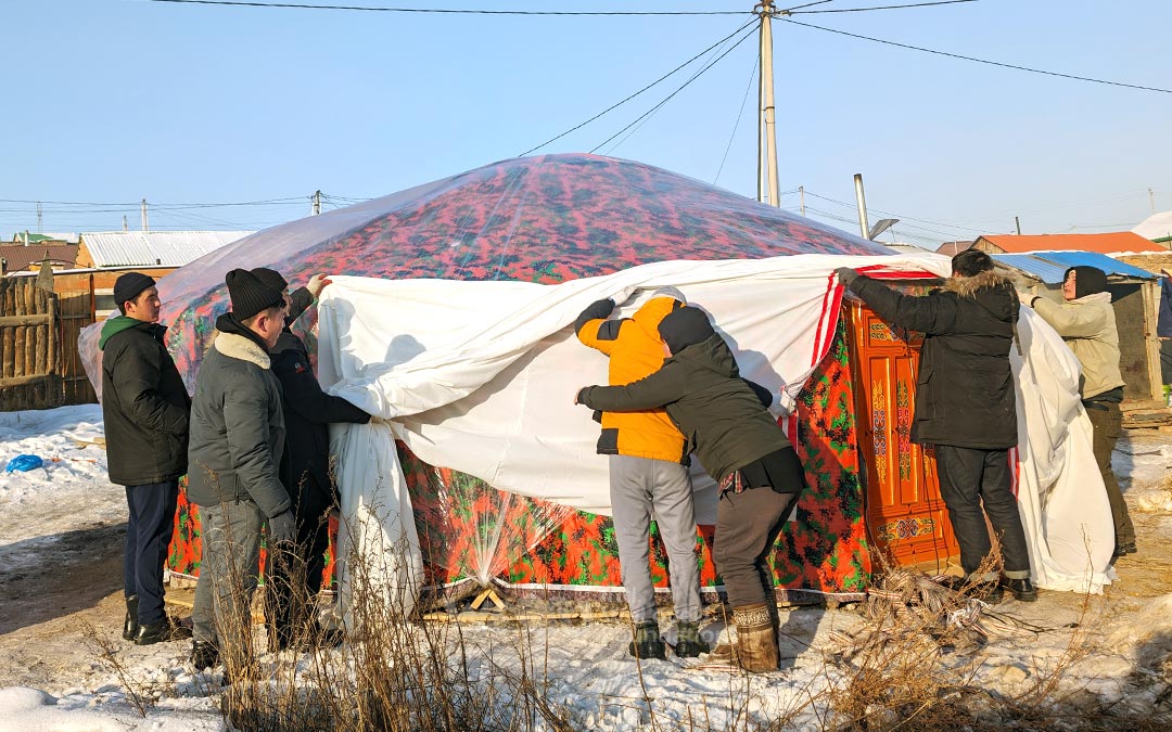 El 1 de febrero, los miembros de WeLoveU ayudaron a los vecinos a instalar sus gers. A pesar del clima amargamente frío con respiraciones heladas, trabajaron diligentemente, pensando en sus vecinos que pronto disfrutarían del calor dentro de sus gers.