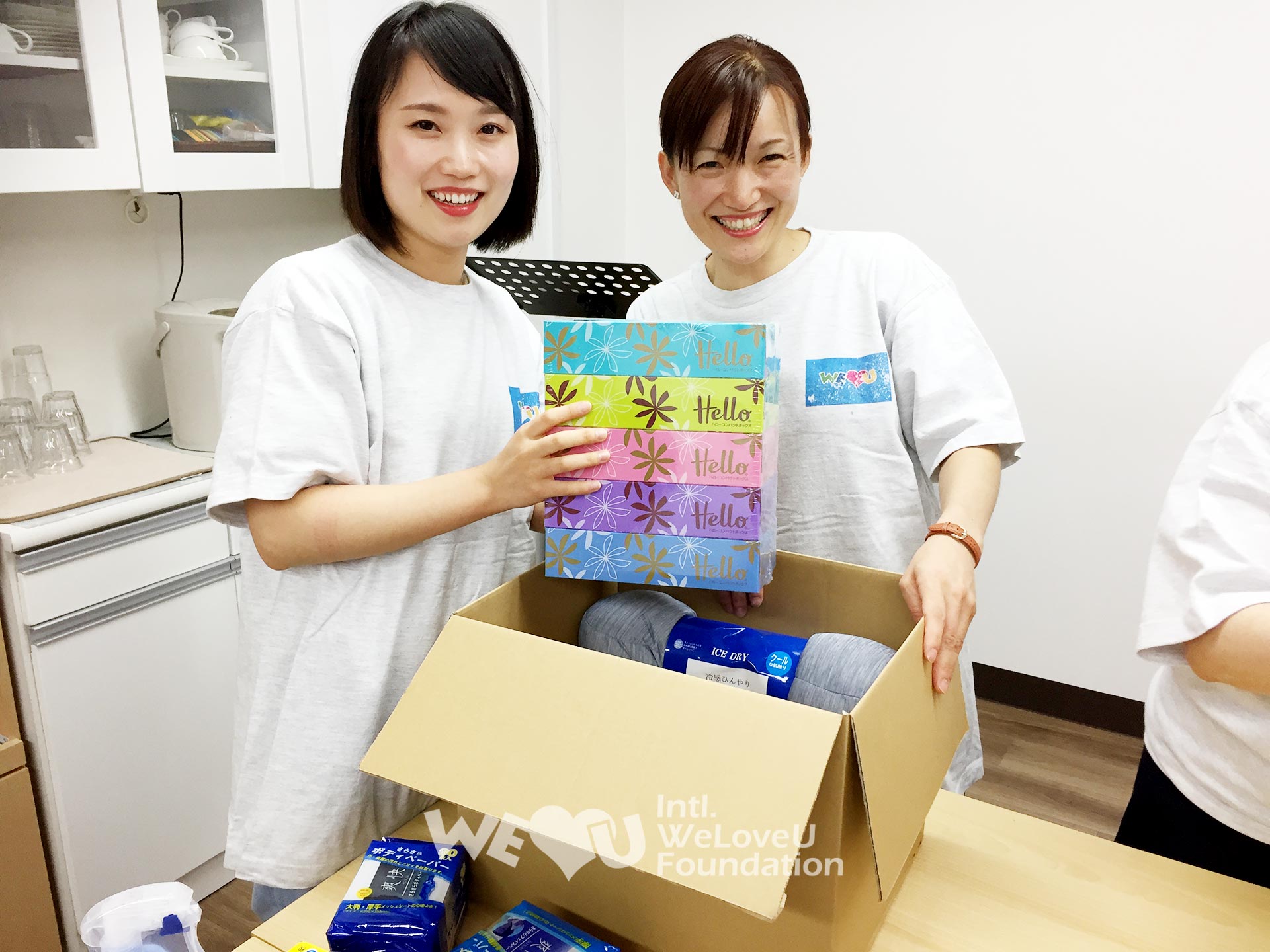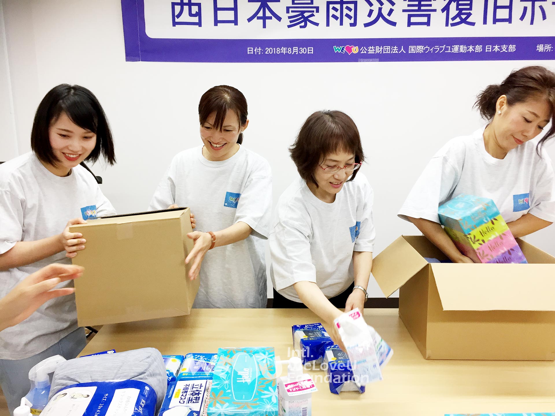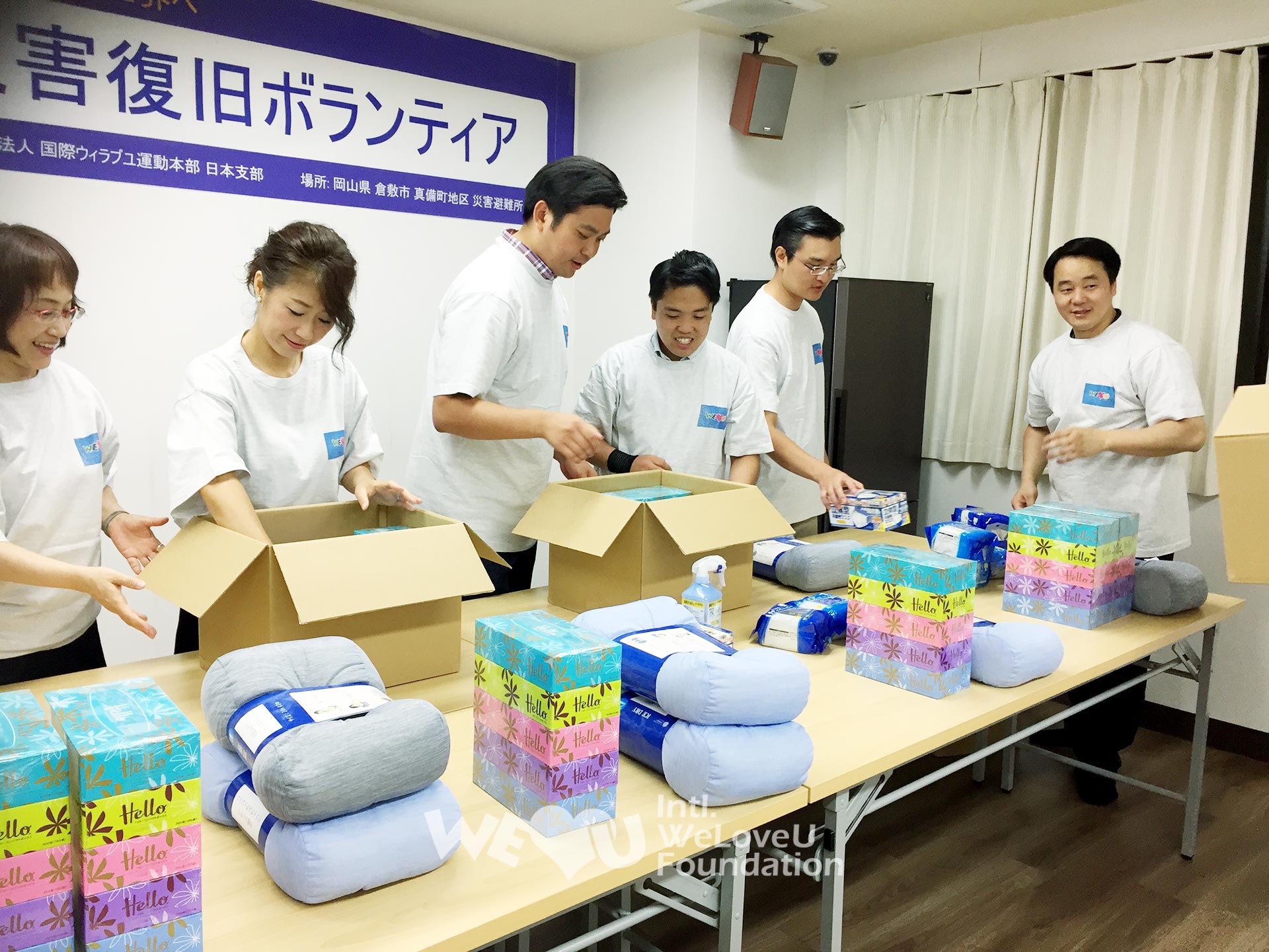 La Fundación Internacional WeLoveU se dirigió a Kurashiki, la zona más afectada, para ayudar a las víctimas. Más de 4600 casas en Kurashiki quedaron sumergidas en el agua, y a pesar de dos meses de trabajo de recuperación, su avance fue lento. El 30 de agosto, 65 miembros de Tokio, Fukuoka, Sapporo y Saitama limpiaron los refugios (inodoros, escaleras, pisos, lámparas fluorescentes, etc.) que no fueron administrados adecuadamente durante dos meses, para proteger la salud e higiene de las víctimas. También proporcionan suministros de ayuda para las víctimas (toallitas, alcohol de desinfección, almohadas funcionales, papel higiénico, etc.).
