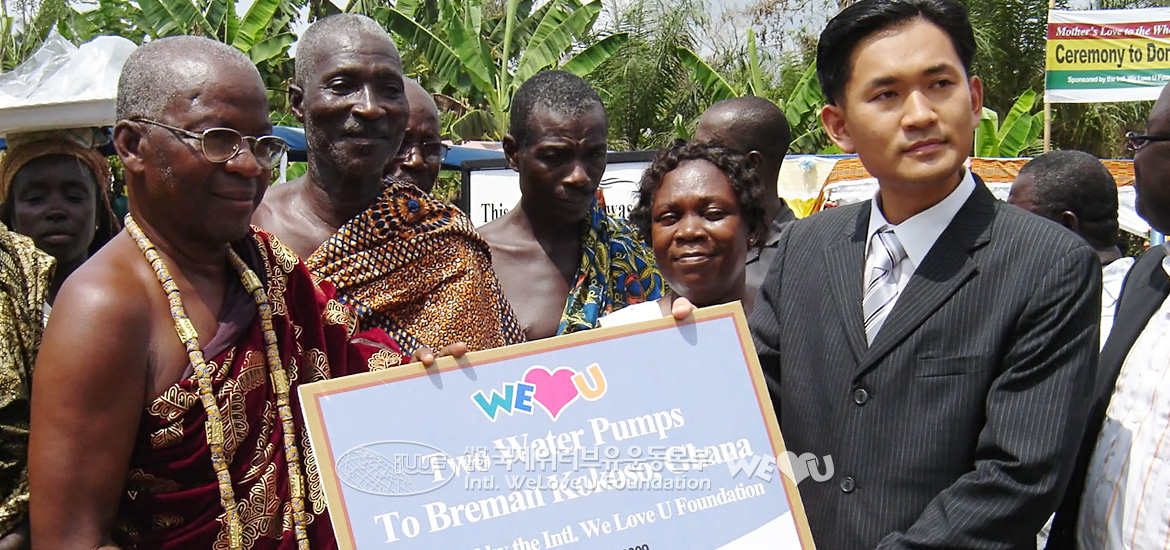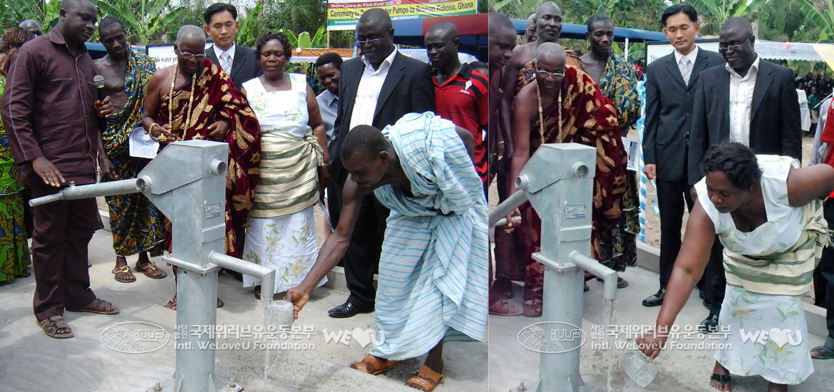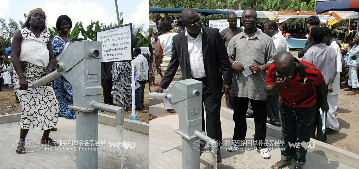 Para ayudar a nuestros vecinos globales que viven en África, la Fundación Internacional WeLoveU colocó bombas de agua en Breman Kokoso, un pueblo del distrito de Asikuma-Odoben-Brakwa en la región central de Ghana. En este típico pueblo agrícola, más de 3000 habitantes habían dependido de dos bombas de agua en el centro del pueblo. Debido a que tenían que beber agua del mismo arroyo donde la gente se lava el cuerpo o lava la ropa, sufrían de varias enfermedades, incluyendo la enfermedad de la lombriz de Guinea. Los médicos les aconsejaron no beber agua del arroyo, pero aun si querían obtener agua del subsuelo, tenían que esperar en largas colas porque no tenían un buen sistema de suministro de agua, y los pobladores que viven en las afueras de la aldea dejaban de extraer agua subterránea y bebían del arroyo como de costumbre.