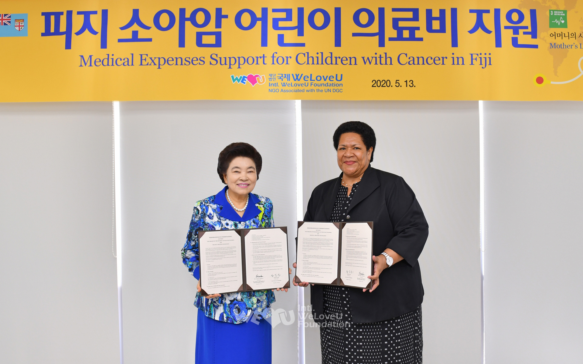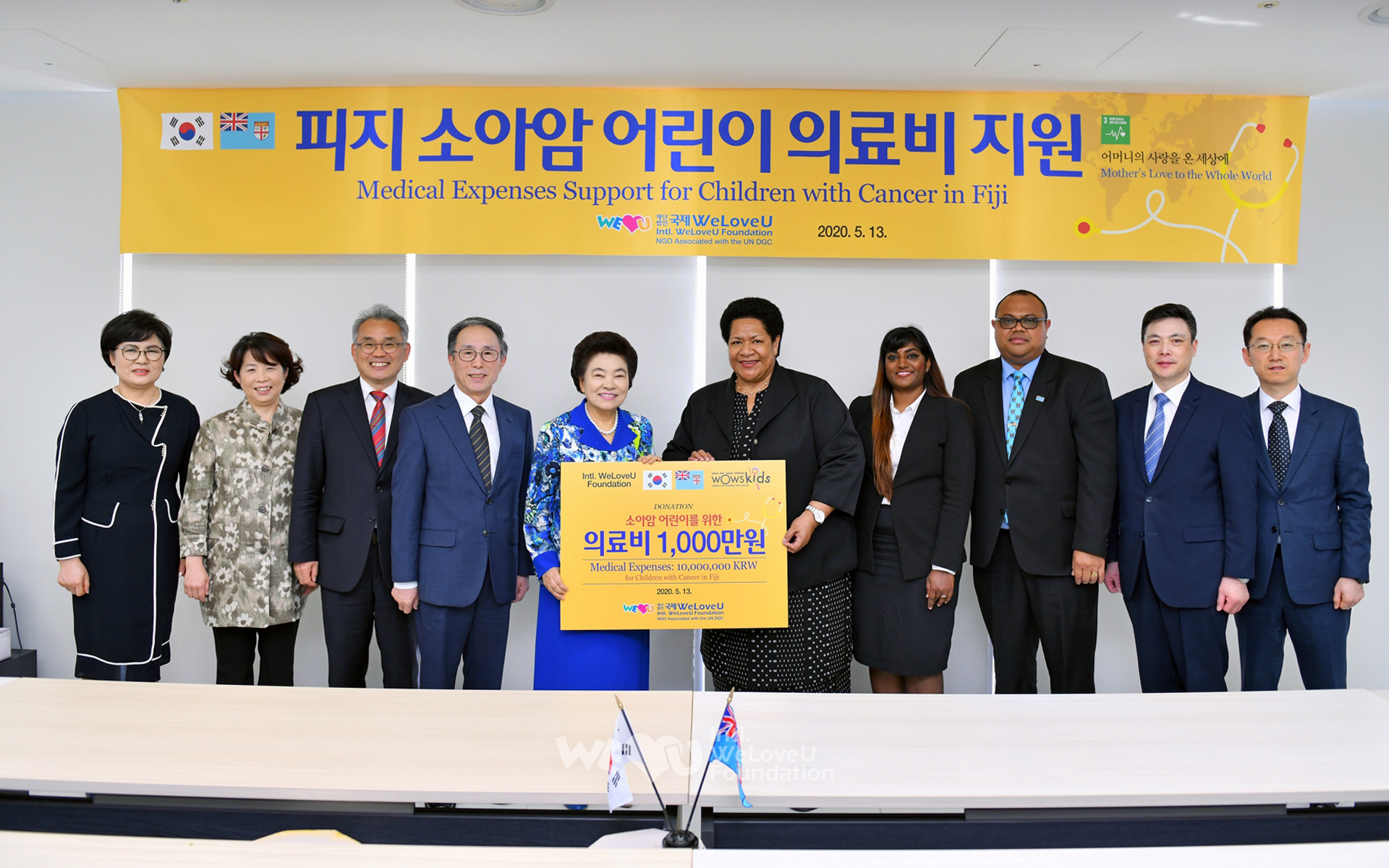 El 13 de mayo, la ceremonia de donación de fondos se realizó en la Sede (Gran Asamblea) de la Fundación Internacional WeLoveU ubicada en Seongnam, Gyeonggi-do, Corea. El evento contó con la presencia de la Presidenta de la Fundación Internacional WeLoveU, Zahng Gil-jah, el director Lee Kang-min y sus directores, así como de la embajadora de Fiyi en Corea, Peniana Lalabalavu, y los funcionarios de la embajada.