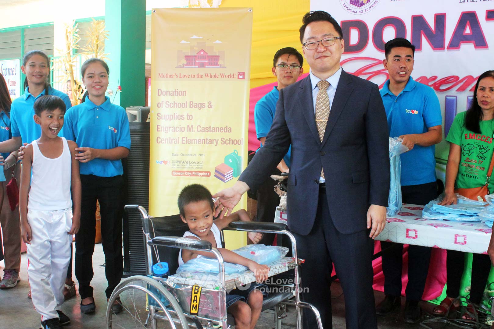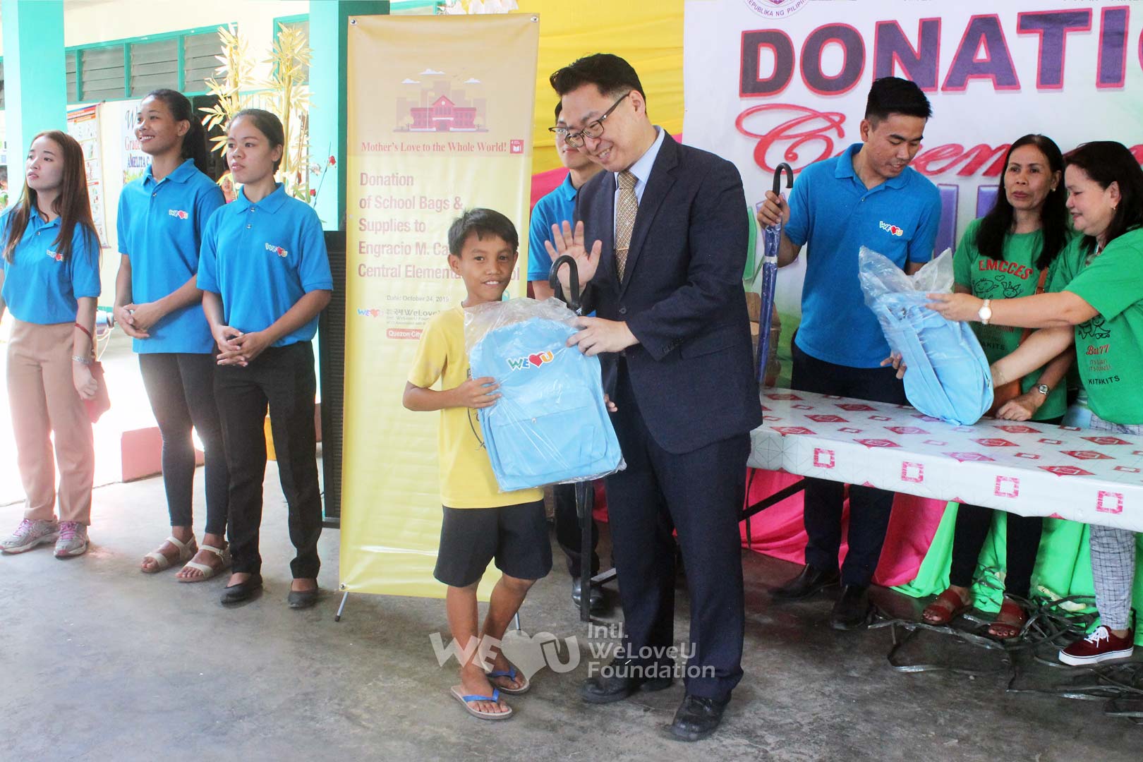 El alcalde Venustiano O. Jordan también agradeció a la fundación a través de su mensaje de felicitación: “Estoy muy agradecido con la Fundación Internacional WeLoveU por llevar a cabo un trabajo significativo para las personas que necesitan ayuda”. Los miembros de la fundación donaron cuadernos, un juego de útiles escolares, una mochila y un paraguas a cada alumno. Los estudiantes sonreían alegremente con las coloridas mochilas escolares y los paraguas con logotipos de WeLoveU.