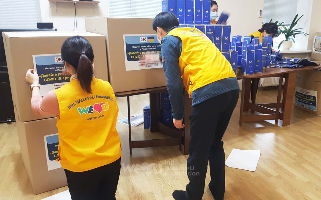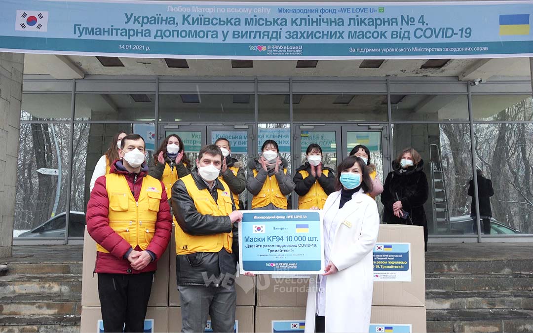 En mayo del año pasado, la propagación del virus disminuyó por un tiempo y se relajaron las medidas preventivas, pero el número de casos confirmados volvió a aumentar poco después. Desde entonces, la Fundación Internacional WeLoveU ha trabajado en estrecha colaboración con la Embajada de Ucrania en Corea para buscar formas de ayudar a Ucrania, y decidió donar 10 000 mascarillas al Hospital Clínico N.º 4 de la Ciudad de Kiev, un hospital designado para el tratamiento de la COVID-19. La fundación decidió enviar a Ucrania mascarillas faciales coreanas con excelente calidad de fabricación y comodidad de uso.