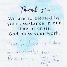“Muchas gracias por tomarse el tiempo y esfuerzo de brindarnos ayuda a quienes lo hemos perdido todo”.