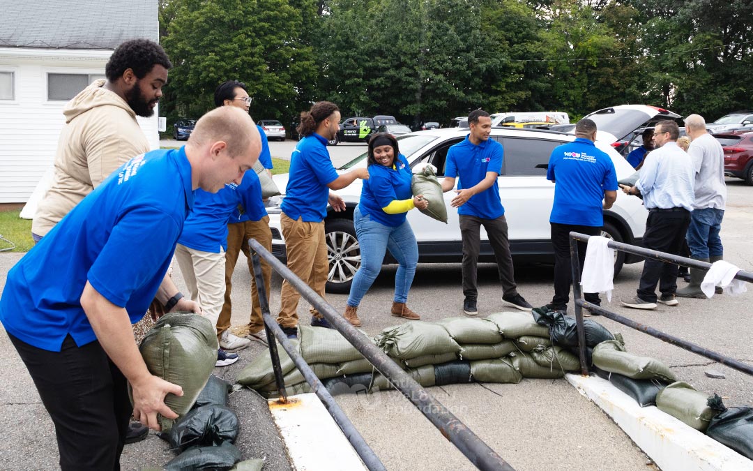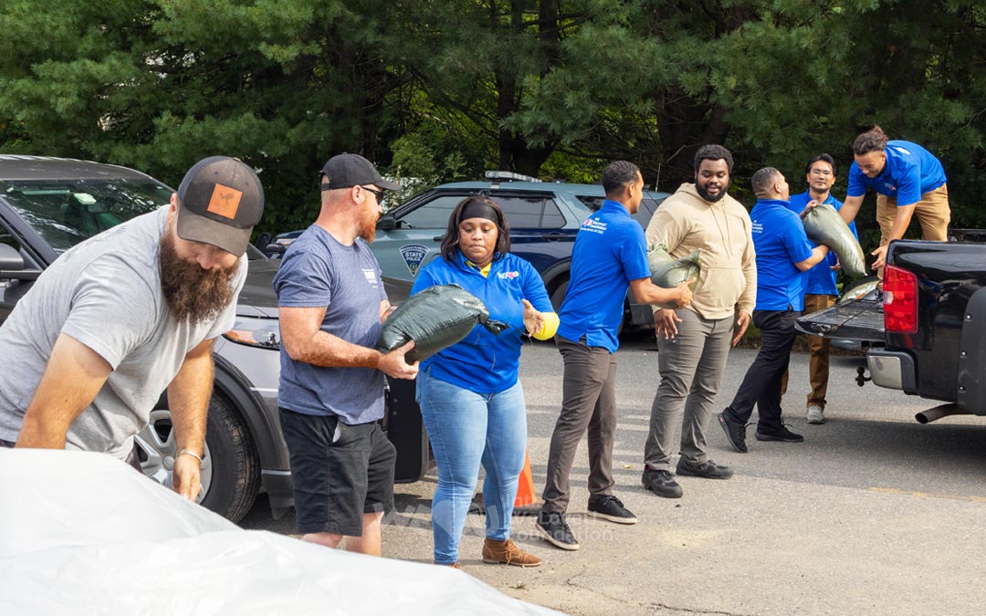 El día 13, mientras la lluvia persistía, los miembros de WeLoveU en Boston llegaron temprano Centro de Gestión de Emergencias de Leominster para ayudar con la preparación para las inundaciones. A fin de apoyar los esfuerzos de respuesta ante emergencias y prepararse para cualquier nueva inundación, los miembros llenaron diligentemente sacos de arena para evitar inundaciones y los distribuyeron a los residentes locales.