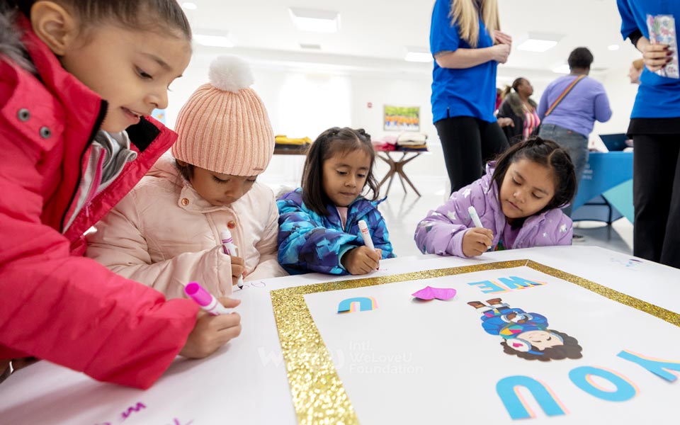 El Centro Comunitario de WeLoveU estaba abarrotado. Dieciocho niños de diez familias, que habían sido invitados, estaban felices de probarse la ropa y los artículos de invierno que les fueron donados. Después de elegir su ropa, los niños expresaron su gratitud y escribieron “gracias WeLoveU” en un papel grande.