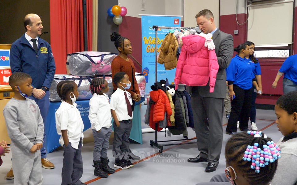 WeLoveU y el distrito de Manhattan trabajaron juntos para entregar ropa y artículos de invierno a ciento veinte estudiantes de la Escuela Primaria Pública Adolph S. Ochs. Los niños se alegraron mucho al encontrar una nota con la frase de ánimo en los bolsillos de la ropa donada. El senador Brad Hoylman, quien repartía la ropa a los niños, dijo: “Me han conmovido profundamente WeLoveU y el distrito de Manhattan, que trabajan juntos para ayudar a los niños necesitados”.