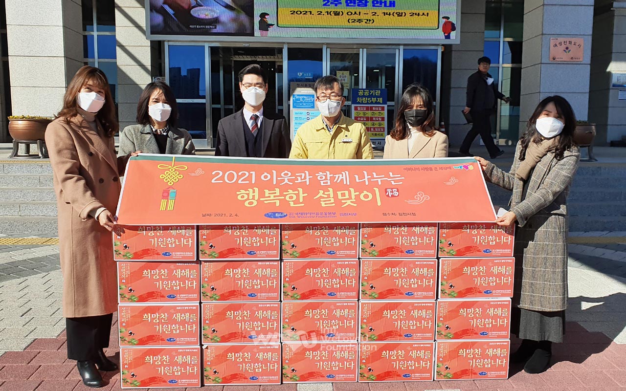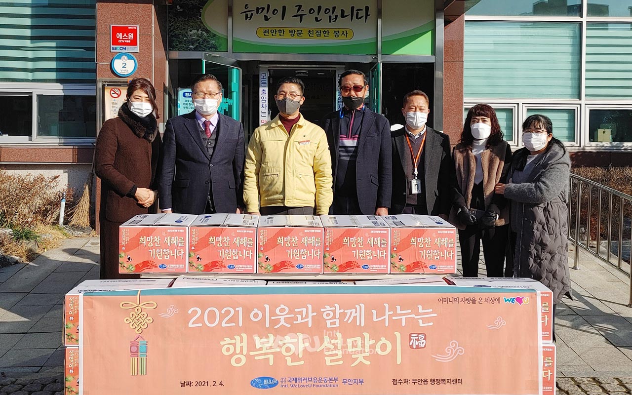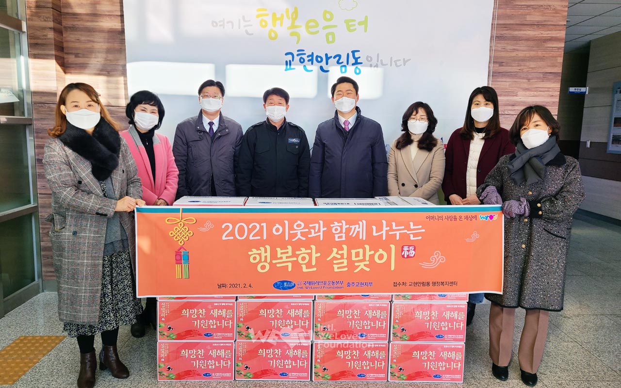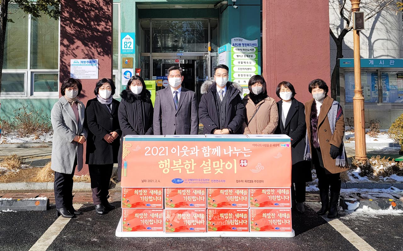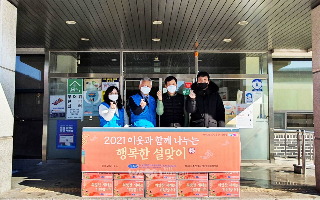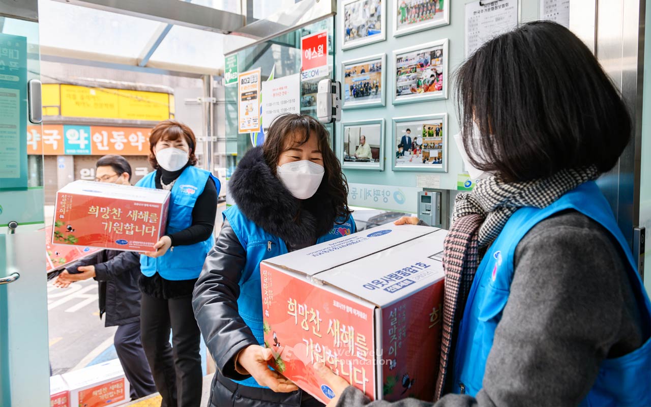 2월 3일부터 8일까지 서울·경기·강원·충청·전라·경상 등 전국 각지에서 이웃 사랑 나눔에 동참했다. 회원들은 시청이나 구청, 행정복지센터 등 각 지부가 속한 62개 지자체를 방문해 조리식품과 식자재로 꾸린 식료품 세트를 기탁했다. 세트에는 송이버섯죽, 쇠고기국밥, 돼지고기 김치찜 등 조리식품과 참치캔, 참기름, 부침가루 등 식자재가 알차게 담겼다. 해당 관공서는 이를 다문화가정과 홀몸어르신가정, 한부모가정 등에 전달했다. 이렇게 해서 복지소외가정 총 1400가구에 위러브유의 설 선물이 전해졌다.