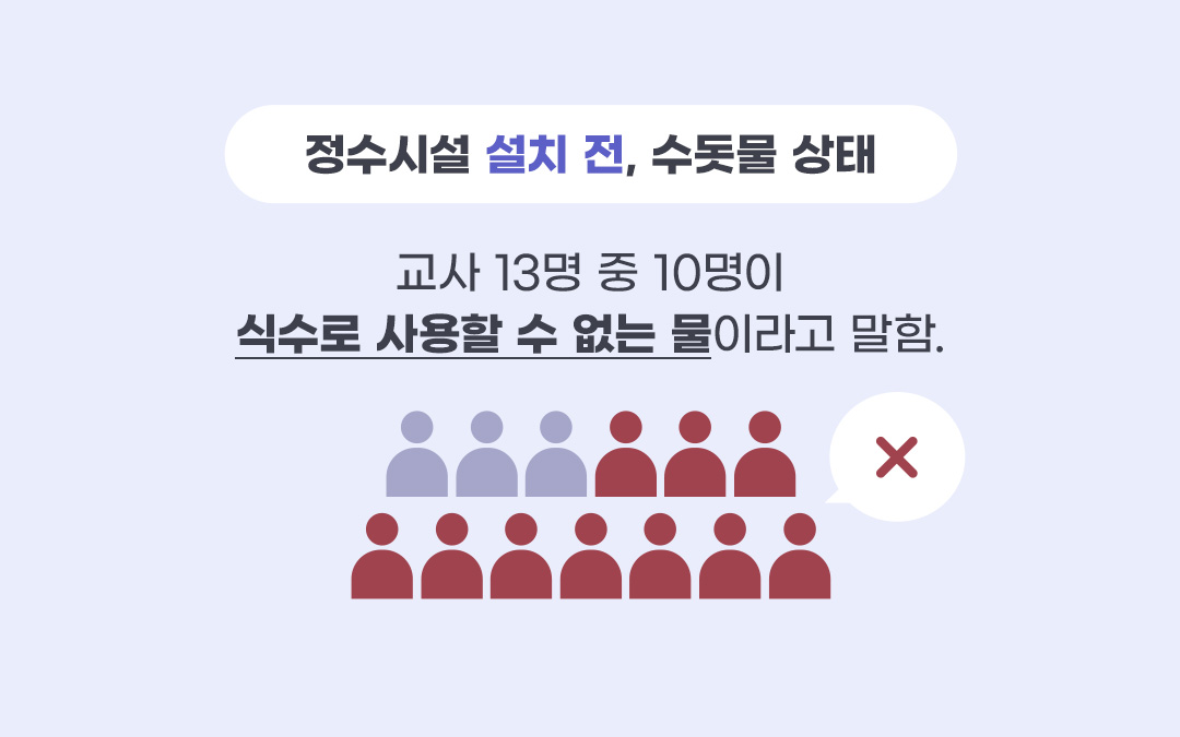 정수기 고장, 식수 오염 등으로 위생환경이 악화됨.