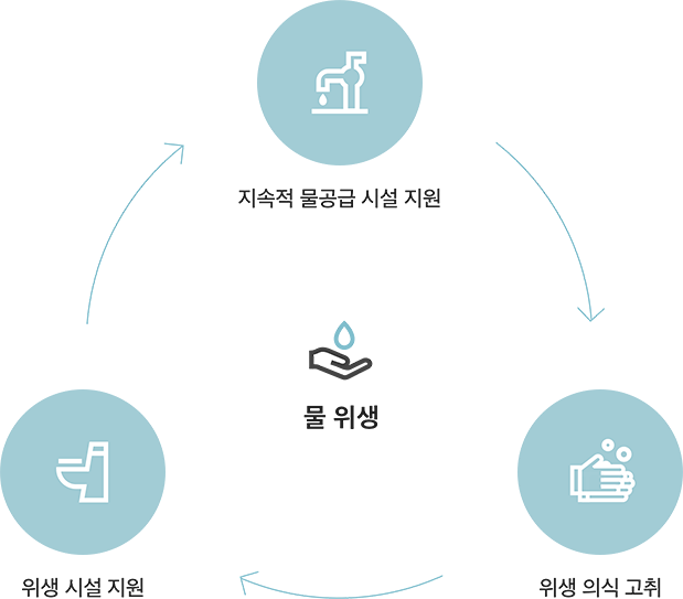 많은 나라의 국민들이 적절한 식수시설과 위생시설 부족, 불안전한 폐수 관리 등으로 인해 생명을 위협받고 있습니다. 아시아, 아프리카 등지의 물 부족 국가에 물펌프, 물탱크, 수도시설 등 물 공급시설을 구축하여, 오염된 물로 인한 수인성 질병 위험을 방지하며 위생적인 환경 조성을 지원합니다.