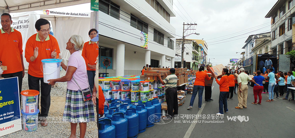 8월 26일, 에콰도르 키토 지부 회원들과 정부 관계자 50여 명이 참석한 가운데 에스메랄다스시에 있는 에스메랄다스주 사회경제통합부 지역본부 건물에서 구호물품 전달식이 진행됐다. 위러브유는 에스메랄다스주 차망가, 무이스네, 포르테테 등 7개 지역 임시 천막촌 9개소에 가스레인지, 가스통, 대형 솥, 냄비 등 조리 시설과 도구를 지원하고 이곳에 거주 중인 644세대에 생필품 세트와 말라리아, 뎅기열, 지카 바이러스 예방을 위한 모기장을 기증했다. 현장에 함께한 미겔 알라르콘(Miguel Alarcon) 사회경제통합부 지역관리본부장은 “물심양면으로 인도주의적 도움을 아끼지 않은 위러브유에 감사한다. 기증받은 구호물품은 이재민 가정에 잘 전달하겠다”고 밝혔다.
