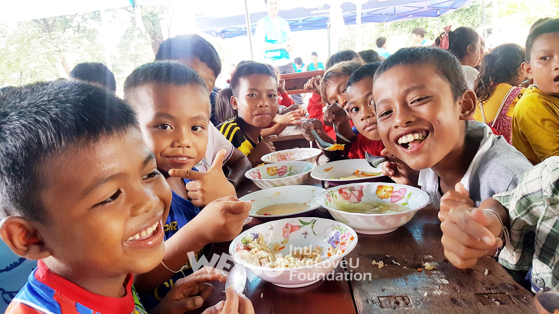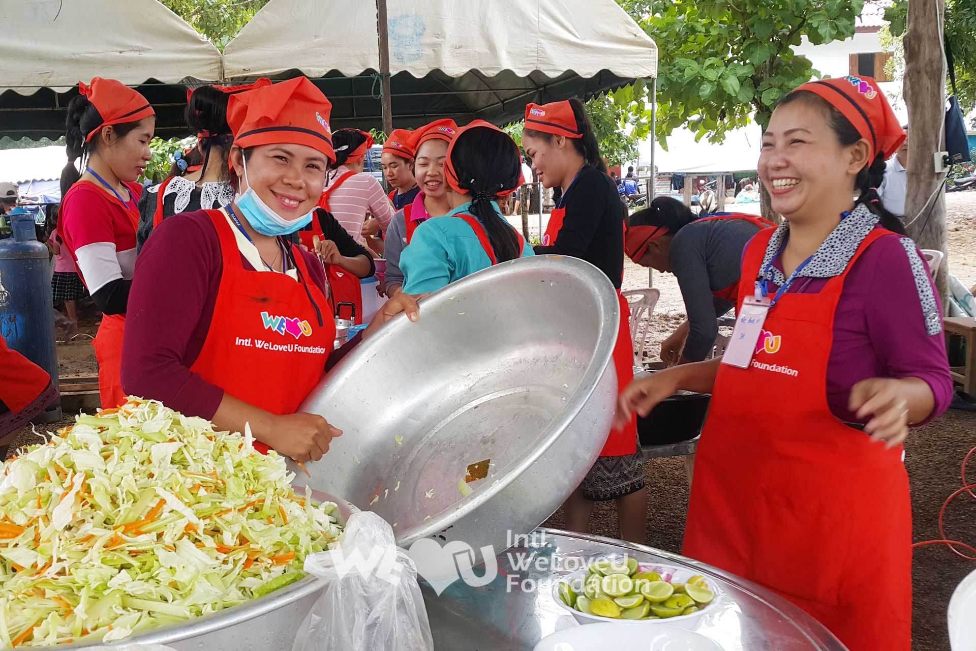 이에 위러브유는 무료급식캠프를 운영하기로 결정하고 8월 2일 수해 현장에 도착했다. 임시 대피소에는 마이, 콕콩 마을 주민 1700여 명과 타힌, 힌라드, 타셍찬, 사몽 주민 1800여 명이 있었다. 이들을 위해 위러브유는 매주 일요일, 250km 떨어진 팍세에 들러 채소, 돼지고기, 닭고기 등의 식자재를 운송했다. 제시간에 조달이 어려운 재료나 취사용 숯 등은 현지 주민에게 직접 구입했다. 아타프주 재해대책본부에서 식자재 운반을 위해 군용 차량을, SK건설에서 장비를, 태국 오프로드 동호회에서 쌀, 계란, 각종 채소, 손전등 등을 지원해주기도 했다.