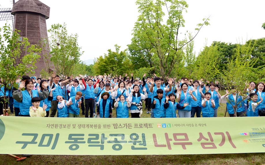 같은 날, 구미시 동락공원에서는 위러브유 회원 가족 300여 명이 모여 산수유나무 150그루를 심었습니다. 전날 내린 비로 흙이 포슬포슬해 아이들의 서툰 삽질에도 땅이 잘 파졌습니다.