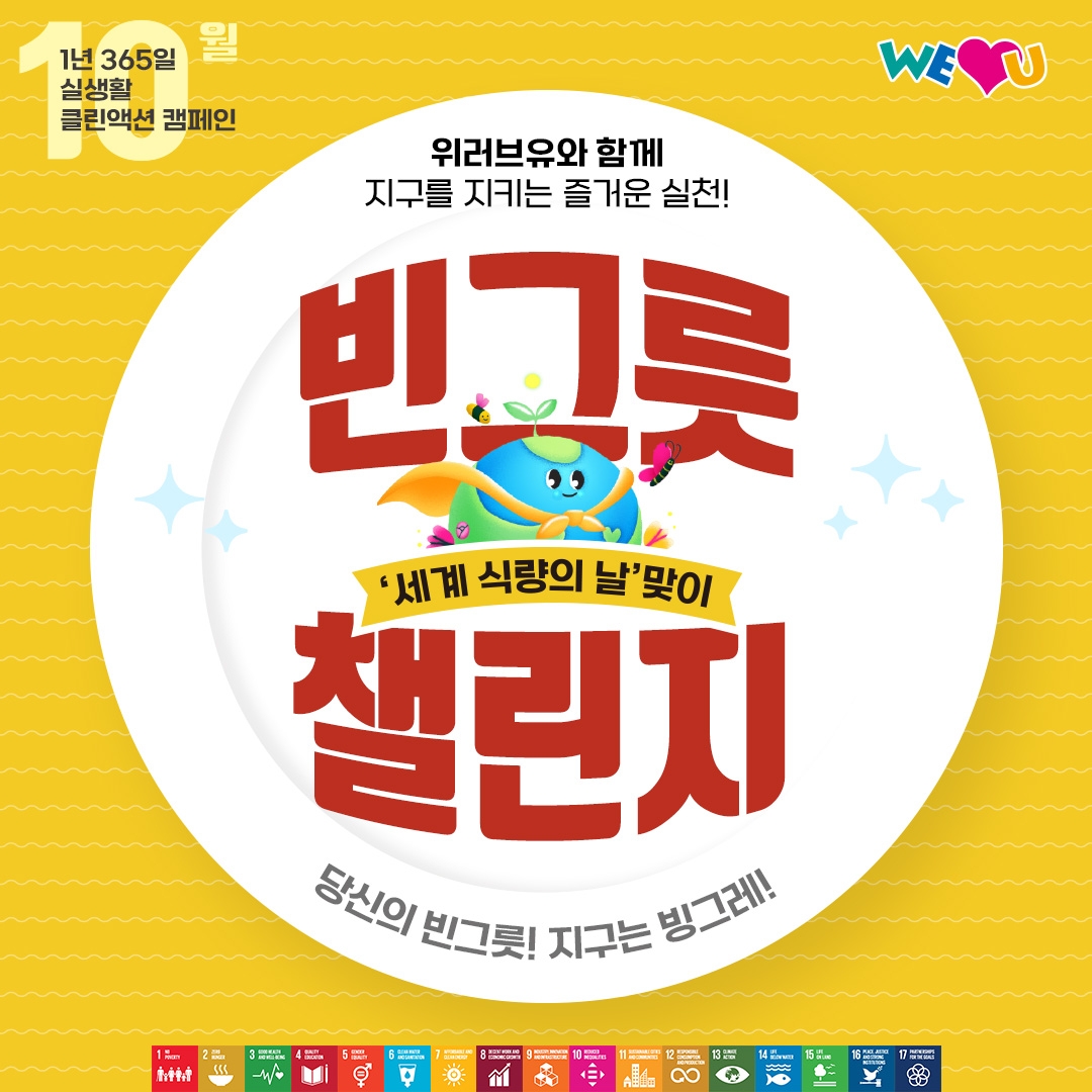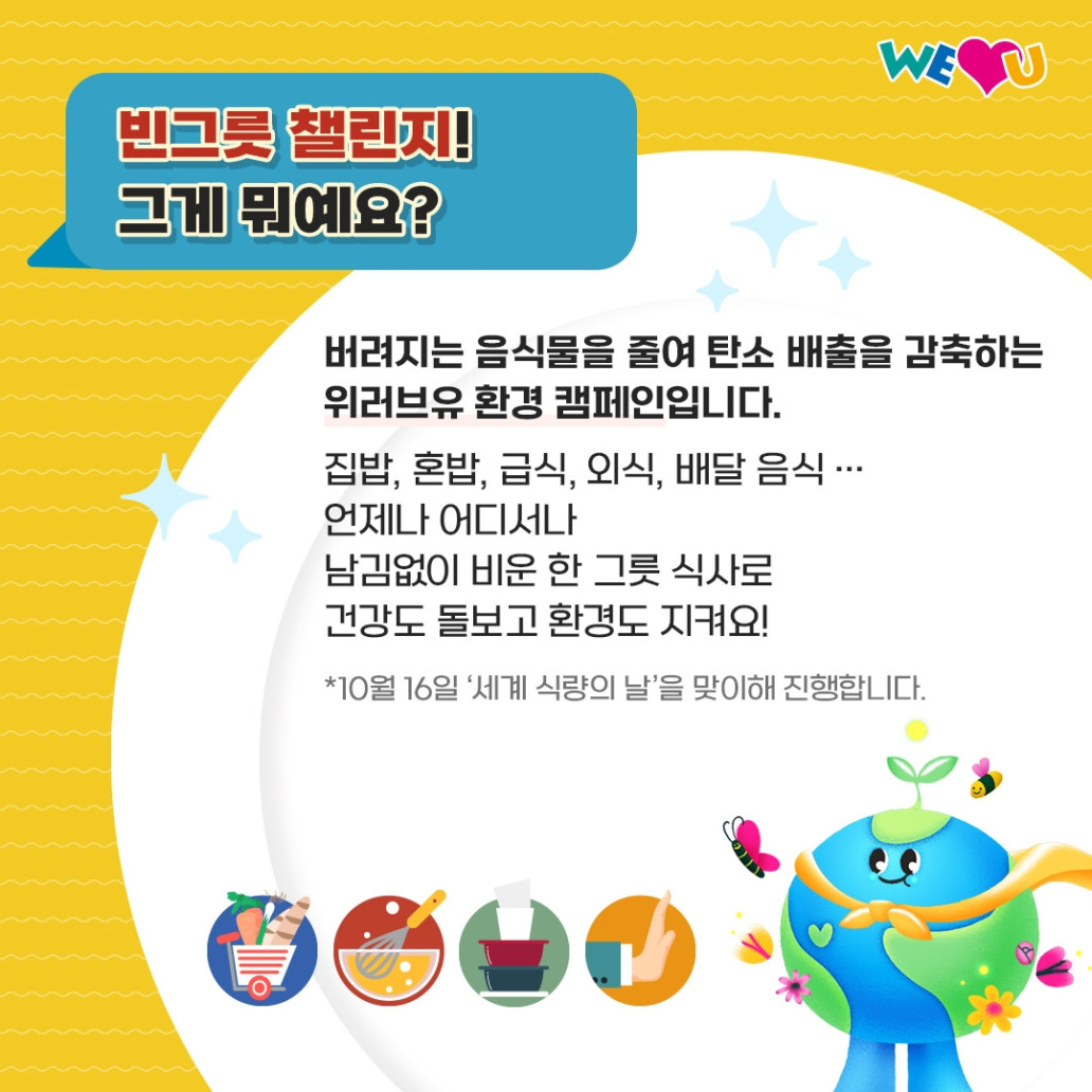 위러브유는 음식물 쓰레기로 인한 탄소 배출을 줄이기 위해 10월 한 달 동안 ‘빈그릇 챌린지’를 진행했습니다. 식사를 남김없이 해서 음식물 쓰레기를 만들지 않는 것입니다.