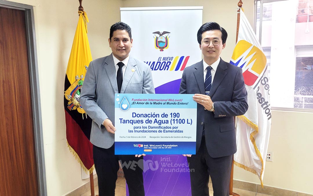“에콰도르를 대표해 감사 인사 드립니다. 한국과 에콰도르 두 나라 간의 상호 협력과 국제위러브유 장길자 명예회장님의 지원으로, 저희는 190개의 물탱크를 기부받았습니다. 이는 엘니뇨 현상으로 어려움에 처한 에콰도르 시민들의 많은 생명을 구할 것입니다. 다시 한번 감사드립니다. 위 러브 유!”