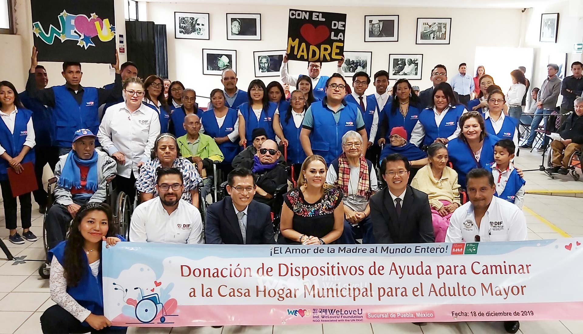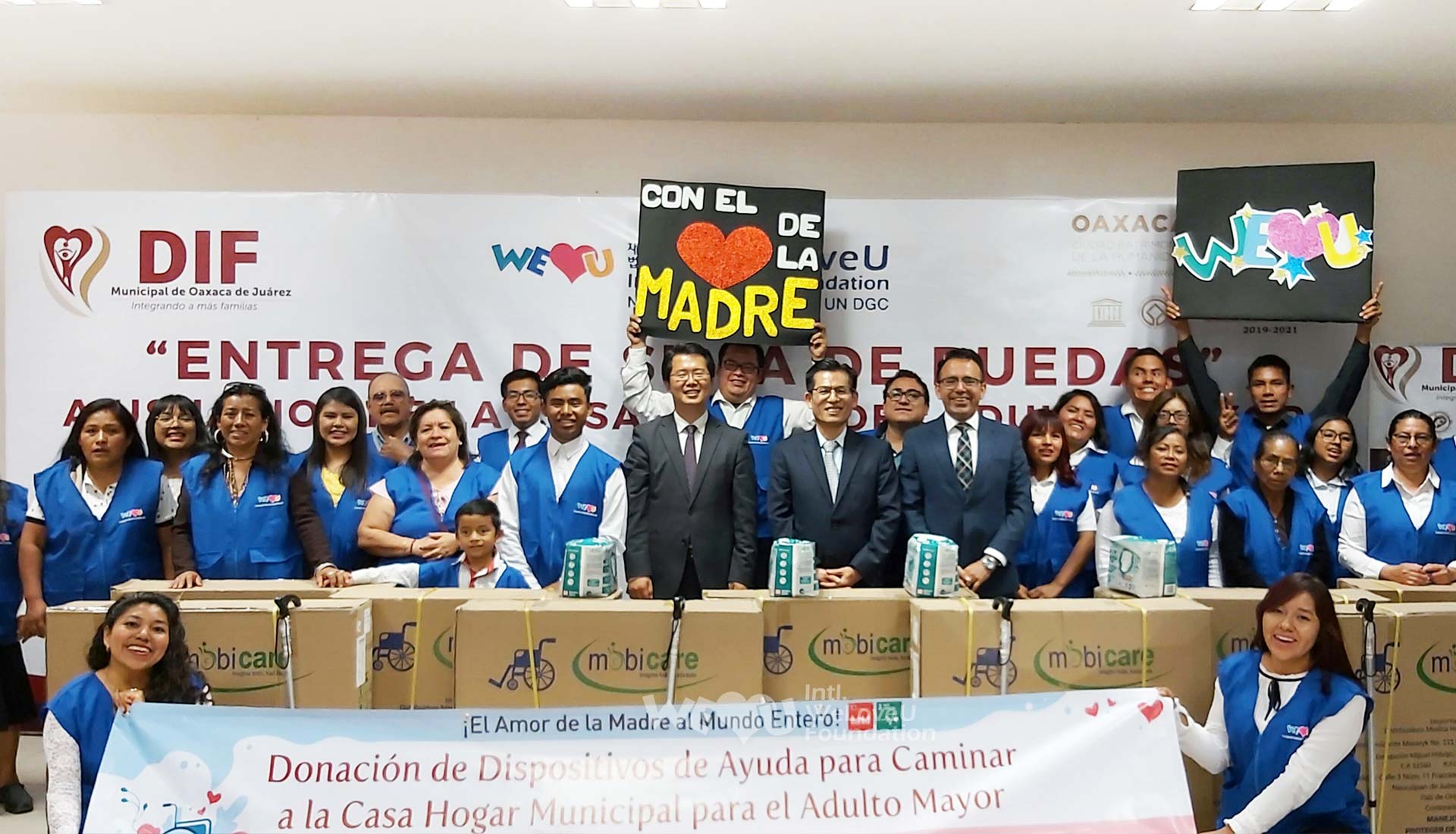 On December 18, the donation ceremony was held in the presence of the WeLoveU members, elderly people, and officials from DIF at the City Nursing Home in Oaxaca, Mexico. The WeLoveU donated walking assist devices—12 wheelchairs and 7 canes—along with 2 boxes of elderly care products. The elderly people tried sitting down on the wheelchairs and were delighted. Some of them were moved to tears of joy.