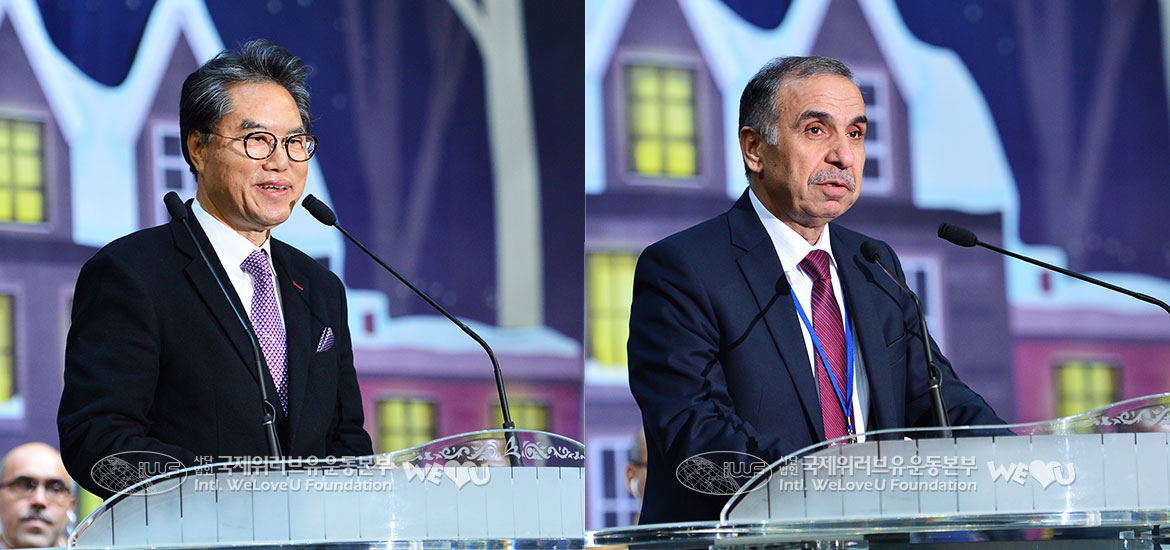 Chủ tịch tài trợ Lee Soon-Jae gửi đến tin nhắn video bày tỏ nỗi nuối tiếc vì không cùng tham gia. Tiếp đến, Chủ tịch Hiệp hội phòng chống ngược đãi trẻ em Hàn Quốc Yi Bae-Keun đọc lời chào. Chủ tịch Yi Bae-Keun nêu ví dụ về Tháp kỷ niệm của Ukraine hình tượng hóa hình ảnh người mẹ chờ đợi con trai trở về từ chiến trường, nghiền ngẫm ý nghĩa của sự kiện rằng “Tháp tình yêu thương của mẹ đã được dựng nên tại nơi này vì những hàng xóm khó khăn đang chiến đấu nhọc nhằn tại chiến tuyến sinh hoạt hiểm trở và thăng trầm thể như chiến trường.” Đại sứ Jordan tại Hàn Quốc Adel Mohammad Adaile đọc diễn văn chúc mừng, hào phóng khen ngợi hoạt động mang tính quốc tế và đa dạng của Quỹ WeLoveU. Đại sứ giải thích sự gia tăng của những người đau đớn bởi phân tranh và tai nạn là tình huống mang tính thời đại, và kêu gọi sự quan tâm liên tục tới người tị nạn bị cướp đi nơi ở của cuộc sống.
