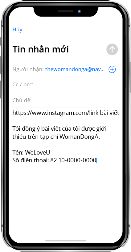 Vui lòng gửi bài viết đến email người phụ trách. Ghi rõ họ tên người đăng ký, số điện thoại, cùng với câu “Tôi đồng ý bài viết của tôi được giới thiệu trên tạp chí WomanDongA.”