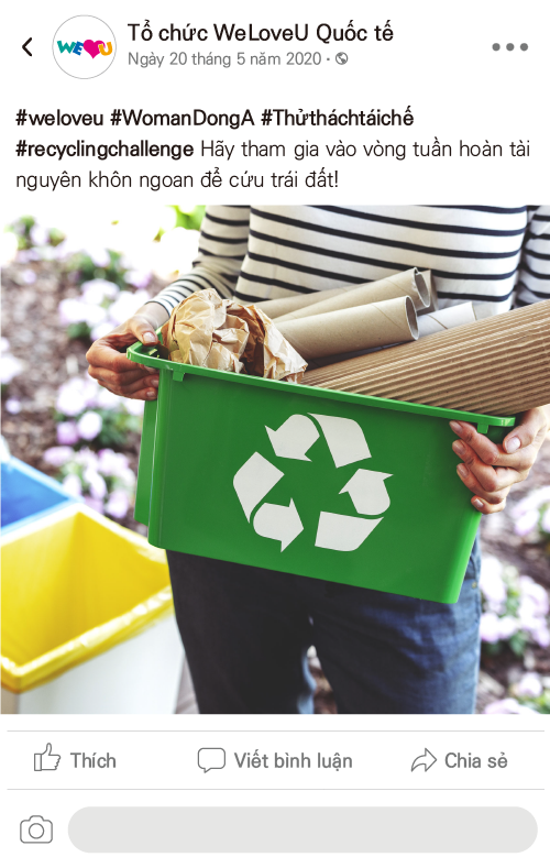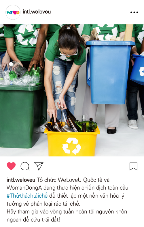 Để thiết lập một nền văn hóa lý tưởng về phân loại rác thải tái chế và luân chuyển các nguồn lực, WeLoveU đang thực hiện chiến dịch toàn cầu #Thửtháchtáichế cùng với WomanDongA.
