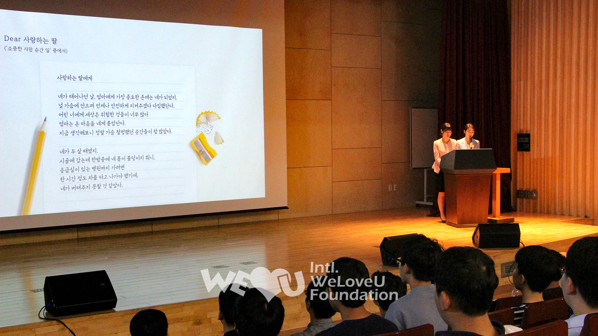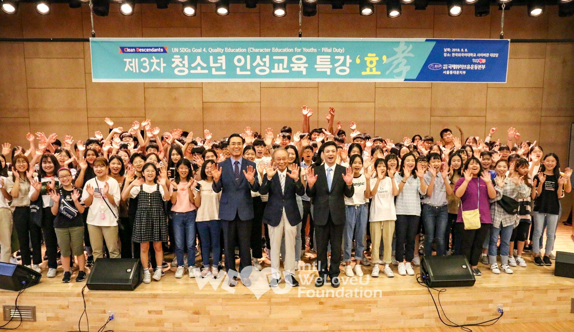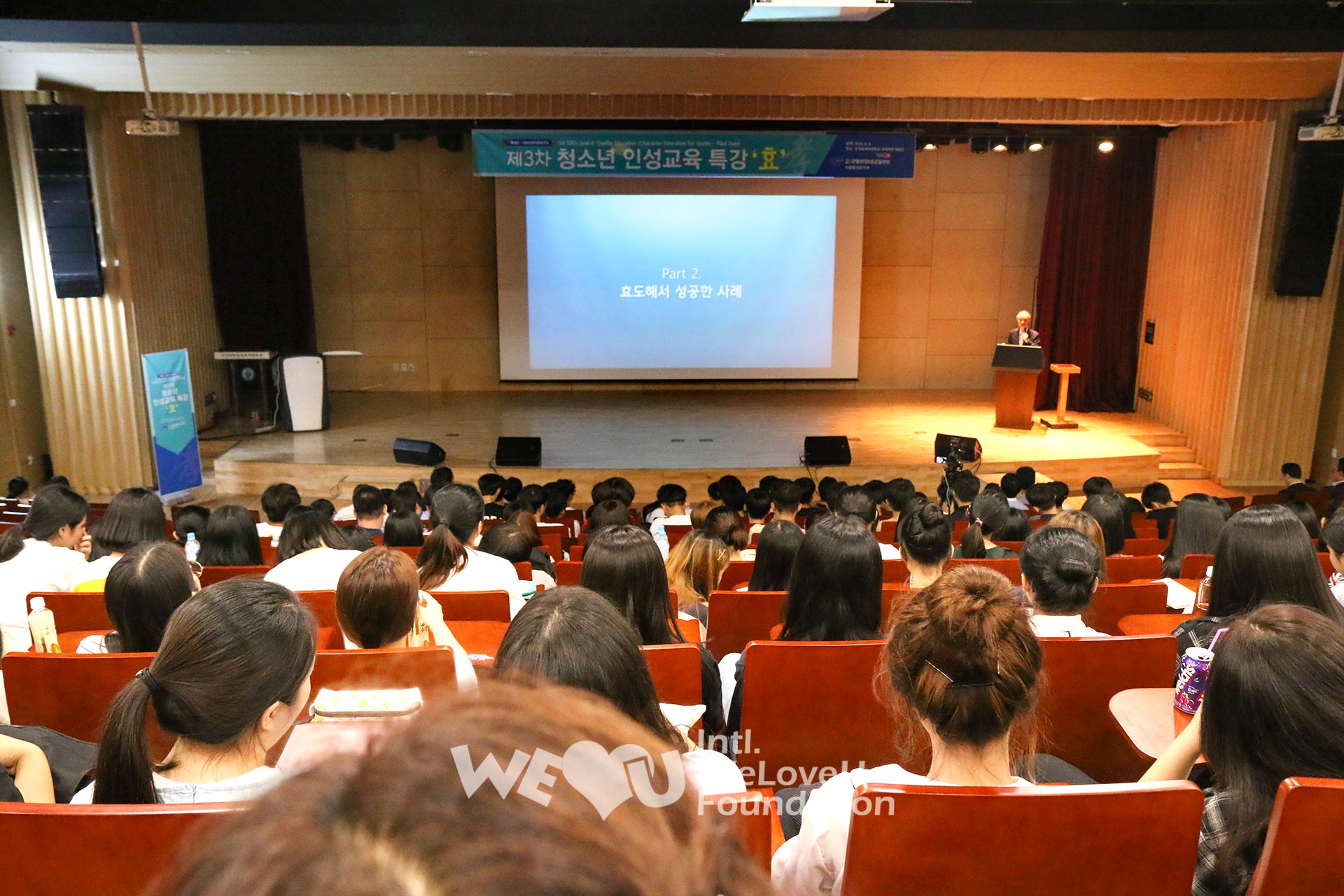 Trong vòng một tháng 8, Quỹ WeLoveU tổ chức giáo dục nhân tính tại 6 địa phương. Khoảng 2.000 người gồm thanh thiếu niên và phụ huynh tham gia ở Seoul, Incheon, Daejeon, Gwangju, Chuncheon, Suwon. Nhiều nhân sĩ đa dạng như giáo sư đại học, Giám đốc danh dự Hiệp hội chính trị, Chủ tịch Nhà Nghiên cứu Tương lai, Giám đốc Viện Phát triển Nhân tính Hàn Quốc v.v… đã được mời thuyết giảng. Họ nhấn mạnh mối quan hệ giữa hiếu thảo và nhân tính, rồi thuyết giảng về tấm gương hiếu thảo vào thời đại mới.
