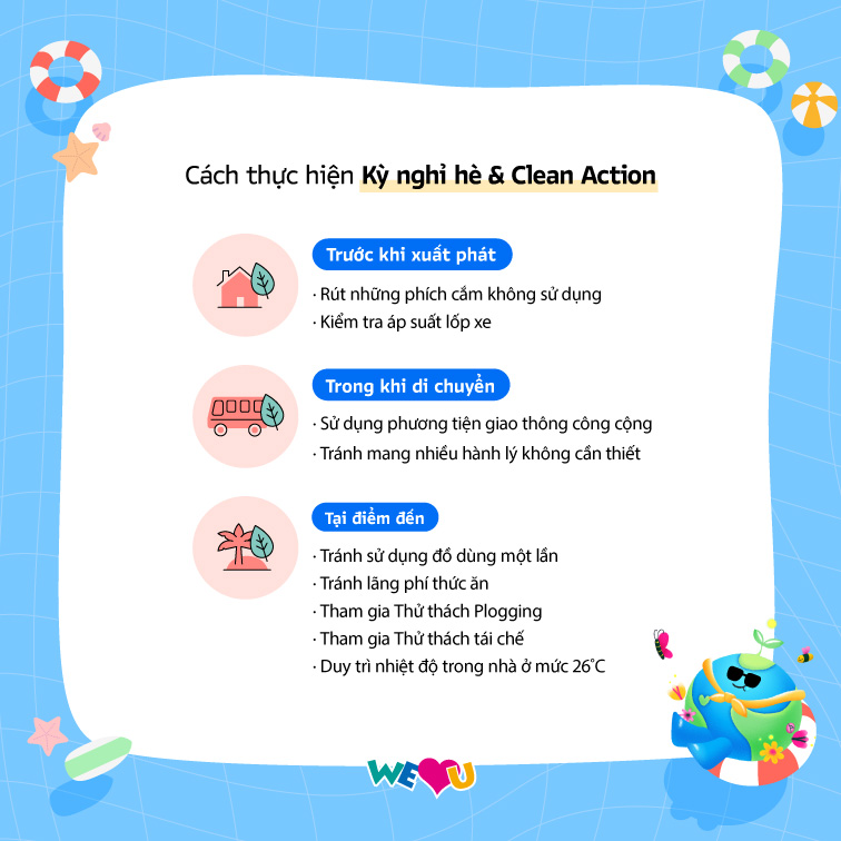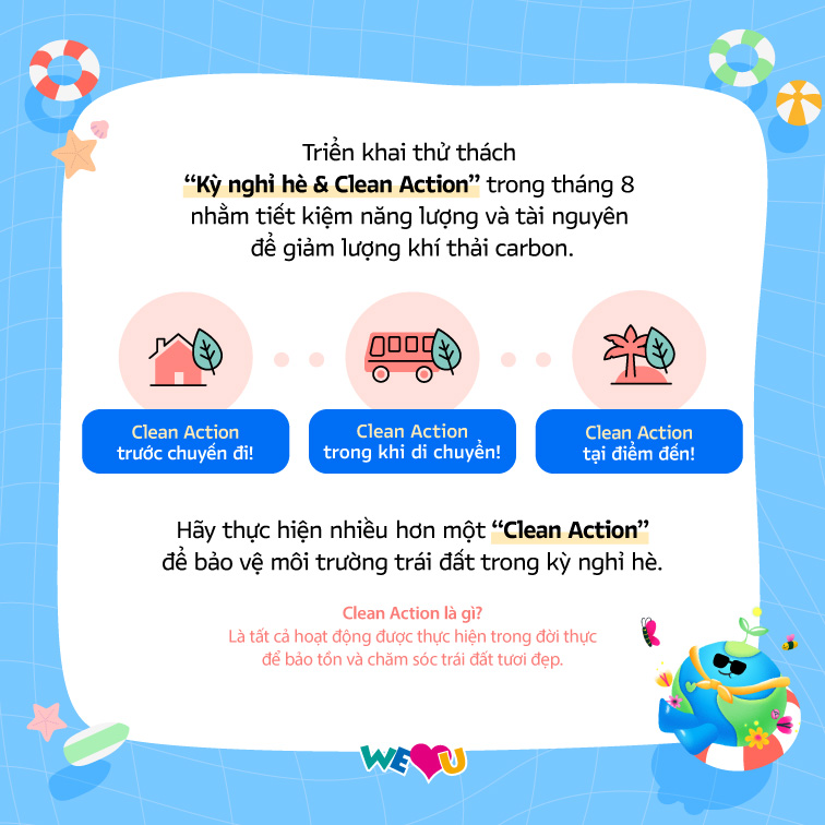 Vào thời điểm thảm họa khí hậu diễn ra ngày càng thường xuyên bởi sự nóng lên toàn cầu, Tổ chức WeLoveU đã quyết định thực hiện một cuộc phản công nhỏ nhưng mạnh mẽ trước sự tấn công đáng sợ của sự nóng lên toàn cầu. Đó là thông qua thử thách “Kỳ nghỉ hè & Clean Action” nhằm tiết kiệm năng lượng và tài nguyên để giảm lượng khí thải carbon.