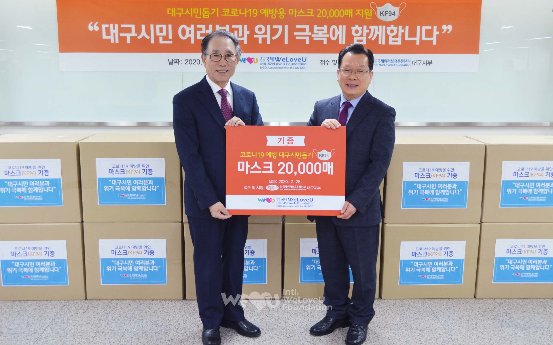 Quỹ WeLoveU Quốc tế xung phong đối ứng Covid-19 để đề phòng truyền nhiễm. Ngày 28 tháng 2, Quỹ WeLoveU trao tặng 20.000 khẩu trang y tế (KF 94) cho Daegu, là địa phương bị hỗn loạn do tình trạng khan hiếm khẩu trang, và phổ cập cho người dân thông qua Quỹ WeLoveU Chi bộ Daegu. Vào thời kỳ phải chú ý phòng dịch về mặt vật lý và phòng dịch về mặt tâm lý, nhiệt tình của các hội viên thêm sức mạnh cho những người đau đớn do bệnh tật.