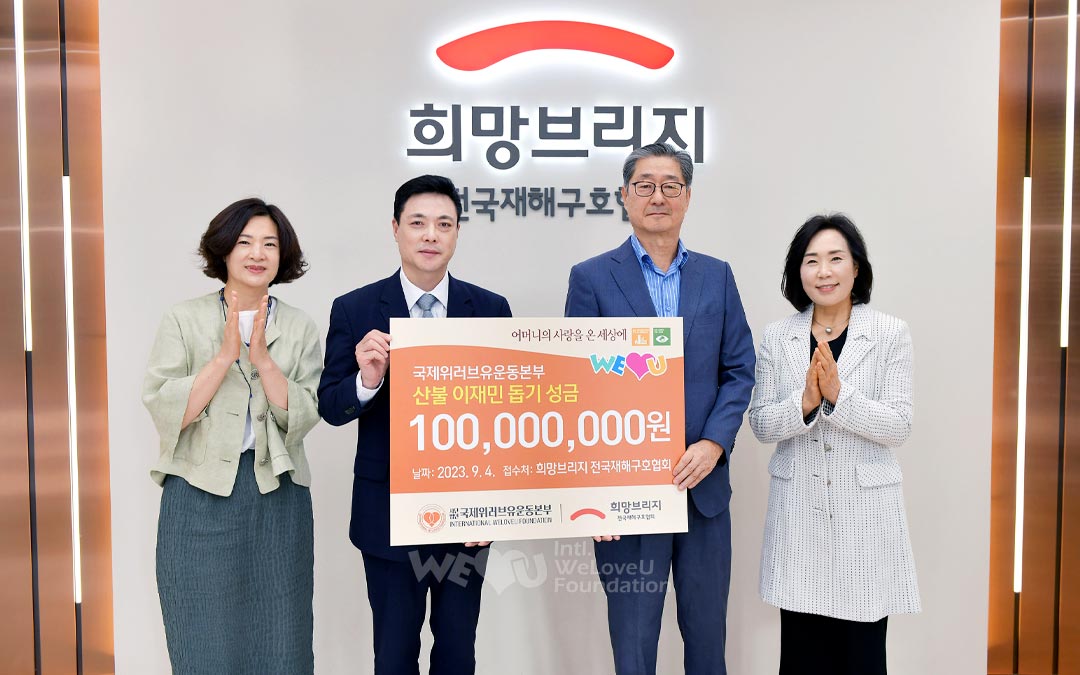 Ngày 4 tháng 9, Tổ chức WeLoveU Quốc tế đã trao 100 triệu won đến Hope Bridge – Hiệp hội Cứu trợ Thiên tai toàn quốc (sau đây gọi tắt là Hope Bridge) để giúp đỡ các nạn nhân vụ trong cháy rừng. Lễ trao tặng được tổ chức tại trụ sở Hope Bridge ở quận Mapo, Seoul. Buổi lễ có sự tham dự của các quan chức, gồm Chủ tịch Hope Bridge Song Pil Ho và Tổng thư ký Kim Jeong Hee. Giám đốc Tổ chức WeLoveU Quốc tế Lee Seung Eon cho biết “Tôi hy vọng tình yêu thương và sự yên ủi của Chủ tịch Zahng Gil Jah sẽ được truyền tải đến tấm lòng của các nạn nhân”. Các thành viên Hope Bridge nói “Các hoạt động phụng sự trên diện rộng của WeLoveU do của Chủ tịch Zahng Gil Jah đứng đầu thật tuyệt vời”, cùng bày tỏ rằng họ sẽ nỗ lực truyền tải tấm lòng ấm áp của các hội viên WeLoveU đến các nạn nhân cùng với số tiền trao tặng.
