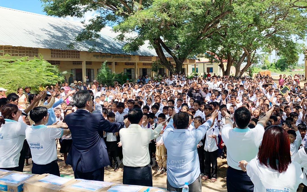 Lễ trao tặng bắt đầu tại sân trường, nơi được lấp đầy bởi các quan chức Bộ Nội vụ Campuchia, hiệu trưởng, giáo viên, học sinh và phụ huynh.