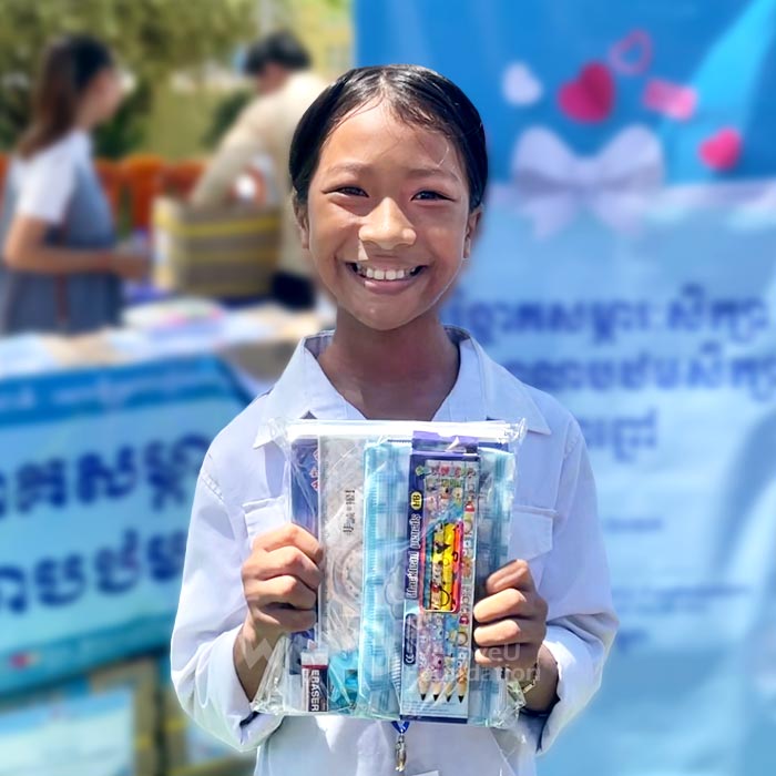 Hôm nay là ngày WeLoveU tặng đồ dùng học tập cho toàn bộ 1200 học sinh của trường. Chi viện lần này được thực hiện theo đề nghị từ Bộ Nội vụ Campuchia, nhằm cải thiện điều kiện giáo dục tại các trường học ở địa phương.