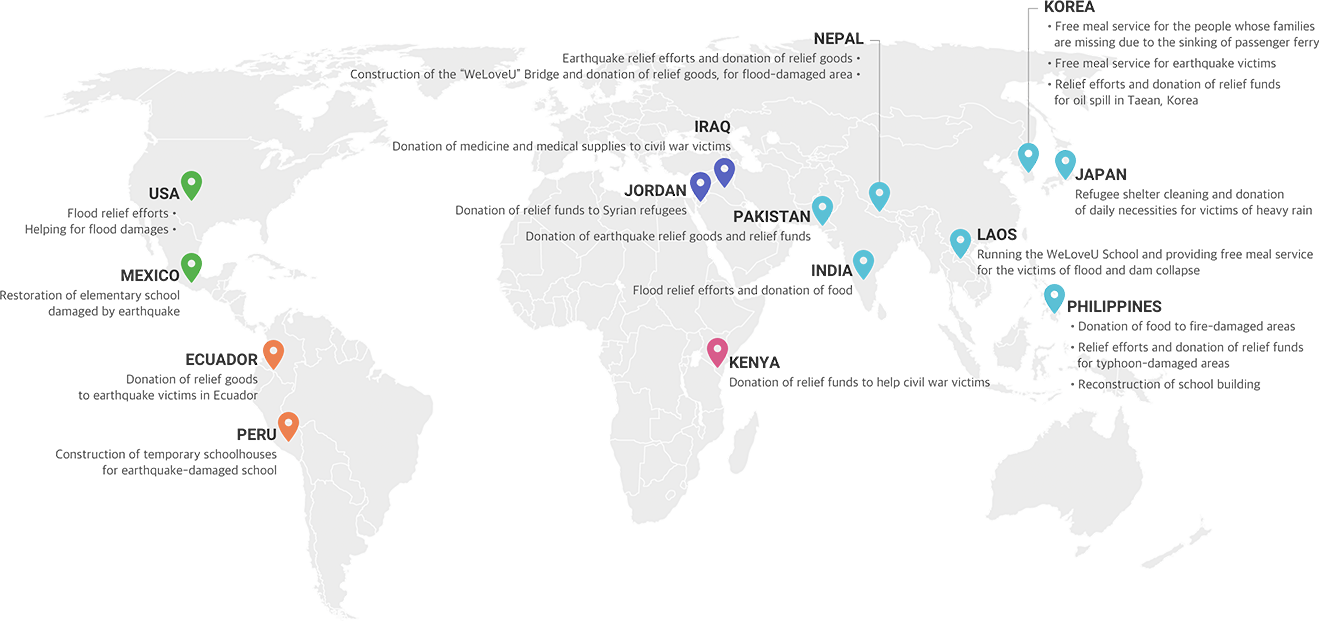 Thảm họa lớn bất ngờ làm cho cuộc sống của một người bị sụp đổ hoàn toàn và thậm chí phá hủy nền tảng xã hội của một quốc gia. Chúng tôi tổ chức hoạt động cứu hộ khẩn cấp cho dân tị nạn bị uy hiếp sự sống do các cuộc chiến tranh và nội chiến xảy ra bởi các vấn đề chủng tộc & dân tộc & tôn giáo & quốc tịch & chính trị và sự hỗn loạn về kinh tế & xã hội, và cho dân tị nạn vì khí hậu & các nạn nhân bị mất nhà cửa và sinh kế do thảm họa môi trường, động đất và nạn đói.