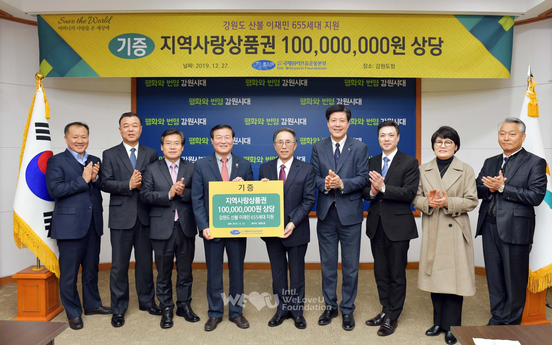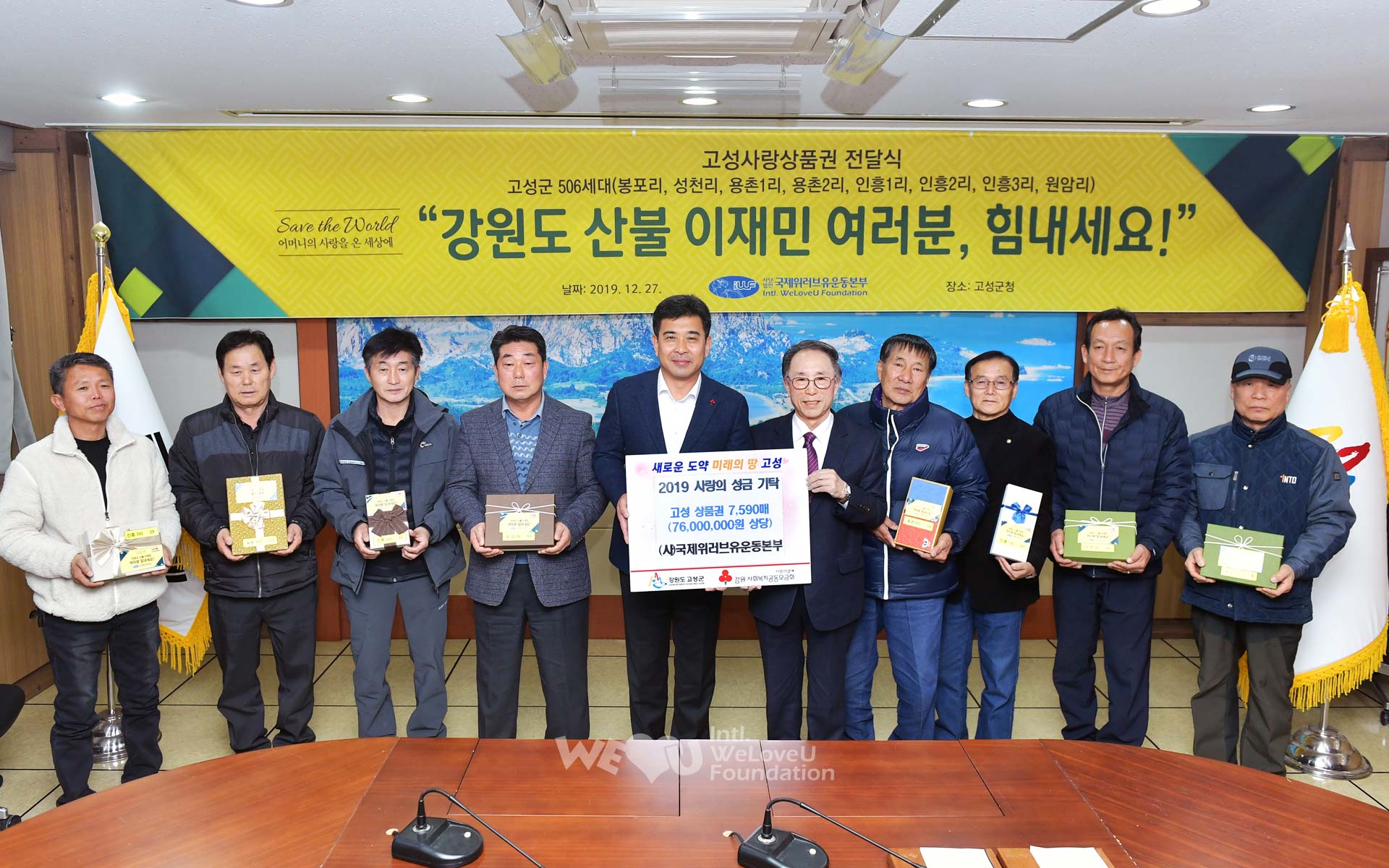 Trước thềm năm mới, Quỹ WeLoveU Quốc tế đã giúp sức cho sự vực dậy của nạn nhân vụ cháy rừng Gangwon-do bằng cách trao tặng Thẻ quà tặng Yêu địa phương trị giá 100 triệu Won cho 655 gia đình ở các khu vực Goseong, Gangneung, Sokcho, Donghae thông qua cơ quan hành chính địa phương. Thẻ quà tặng Yêu địa phương là Thẻ quà tặng do chính quyền địa phương phát hành để hoạt tính hóa kinh tế địa phương, và có thể được sử dụng ở những nơi được chỉ định như chợ truyền thống v.v…