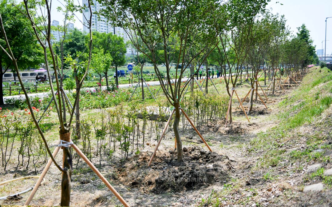 40 cây tường vi trưởng thành (cao 3 mét) có hoa đẹp và khả năng hấp thụ cácbon tuyệt vời đã được trồng tại Công viên thể thao 2, Suối Jungnang.