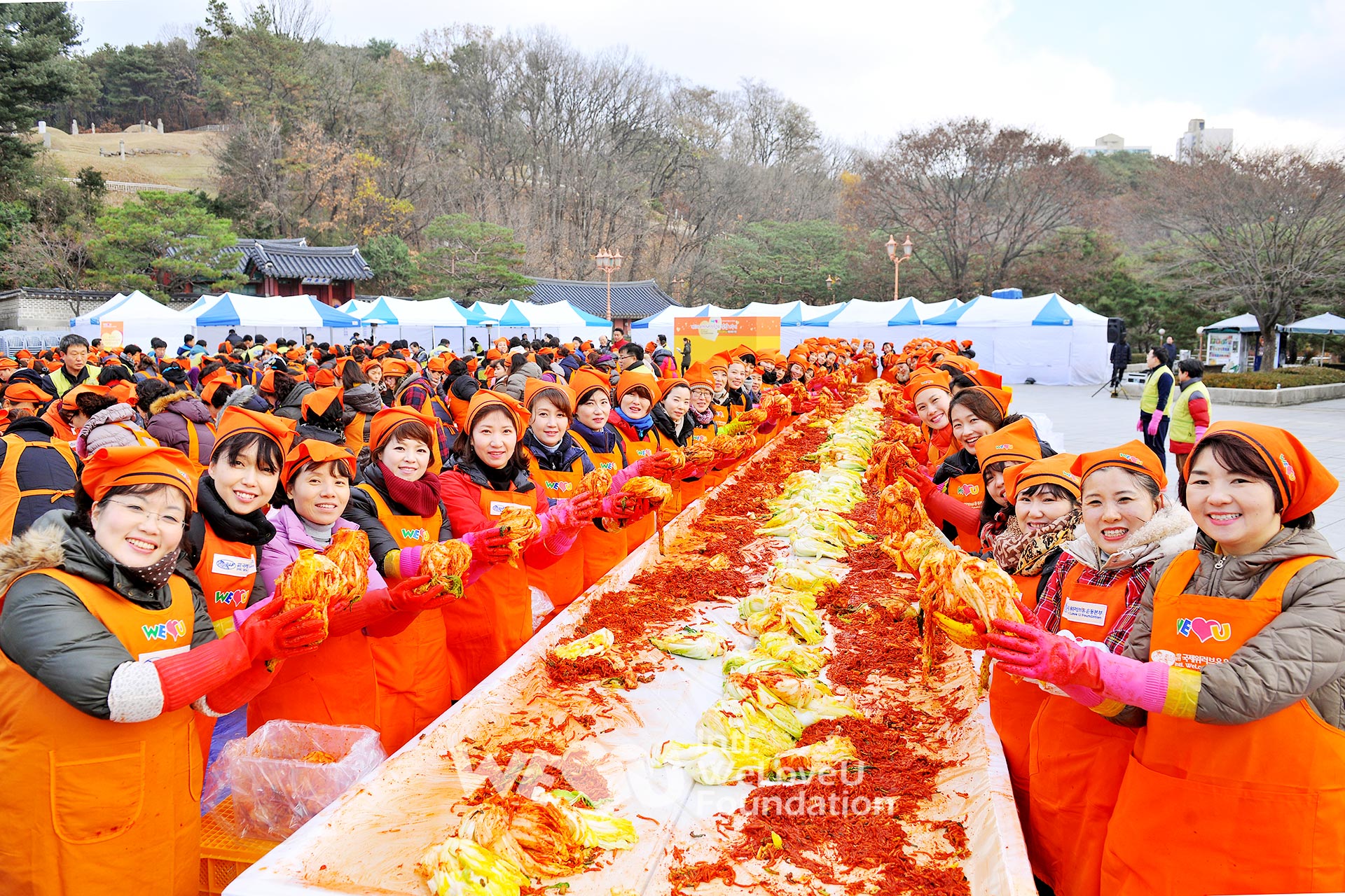 Đây là công việc chuẩn bị cho chương trình “Chia sẻ kim chi tình yêu của Mẹ lần thứ 13” do Tổ chức WeLoveU Quốc tế tổ chức. 3000 cây cải thảo muối trải dài khắp quảng trường, tạo cho mọi người cảm giác như đang ở trên cánh đồng cải thảo. Hầu hết các cây cải thảo này đều mới được thu hoạch cách đây vài ngày, và là thành quả do các hội viên tự tay gieo hạt vào mùa hè và chăm sóc cẩn thận ngay cả trong hạn hán. Bên cạnh cải thảo là phần nhân kim chi có màu sắc đẹp mắt được các hội viên làm từ những nông, hải sản tươi ngon, chất lượng cao của Hàn Quốc.