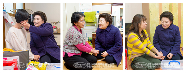 Chủ tịch Zahng Gil Jah làm kim chi cùng các hội viên cả buổi sáng, đã mang kim chi, gạo và các nhu yếu phẩm hàng ngày đến thăm các hàng xóm ở Taepyeong-dong, Seongnam vào buổi chiều. Chủ tịch nói rằng “Các hội viên đã làm kim chi với hết cả tấm lòng và kim chi rất ngon. Các hội viên WeLoveU là người nhà của các vị nên hãy gắng sức lên!”. Với thông điệp ấm áp thể này, Chủ tịch đã động viên từng gia đình gặp khó khăn và chi viện phí sưởi ấm cũng như phí y tế. Những người hàng xóm bày tỏ lòng biết ơn trước lời khích lệ ấm áp và sự giúp đỡ tận tình, sự quan tâm của Chủ tịch đối với những khó khăn nhỏ nhất trong mỗi gia đình mà nói rằng “Mùa đông năm nay có lẽ sẽ rất ấm áp với chúng tôi”. Một người mẹ đơn thân 40 tuổi, một cụ bà neo đơn 70 tuổi, một người mẹ 60 tuổi chăm sóc con gái mắc bệnh ung thư và cháu gái nhỏ,… Trên khuôn mặt của họ đều tràn ngập những nụ cười hạnh phúc.