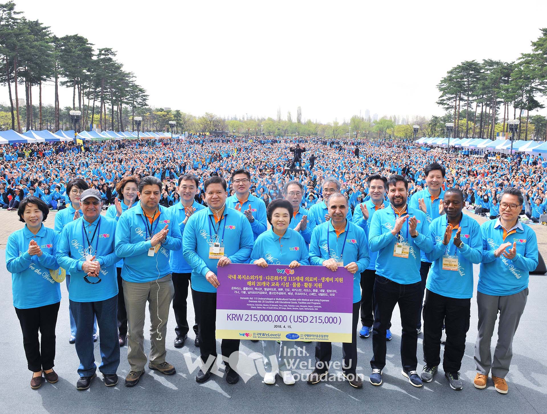 Sau lời chúc mừng, các tấm bảng trao tặng tiền quỹ đã được trưng bày trên sân khấu. Thông qua Đại hội đi bộ lần này, Quỹ WeLoveU định chi viện 215 triệu won cho phí y tế và phí sinh kế cho 115 gia đình thiệt thòi phúc lợi và gia đình đa văn hóa ở Hàn Quốc; và trao tặng phí chi viện cơ sở & vật phẩm & hoạt động giáo dục tới 20 quốc gia ở nước ngoài như Honduras, Ấn Độ, Pakistan, Lào, Mông Cổ, Nepal v.v… Trong giờ chụp hình kỷ niệm, các vị khách quý cùng những người tham gia đều nắm tay, kêu “We love you” và truyền tin nhắn của tình yêu thương và hy vọng cho hàng xóm.
